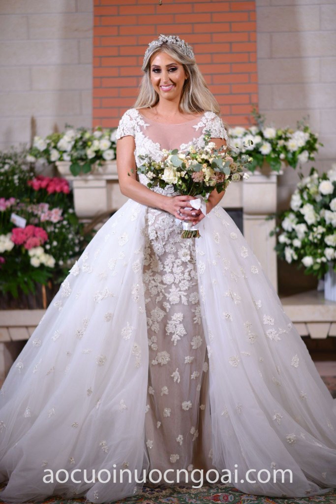 Zuhair Murad vốn nổi tiếng bởi những thiết kế áo cưới 2 trong 1 ấn tượng và đa dụng. Cô dâu diện lên người chiếc váy cưới đuôi cá màu da tay ngắn được trang trí tuyệt đẹp, kết hợp cùng tùng váy có thể tháo rời được trang trí đồng bộ để tạo điểm nhấn ấn tượng.