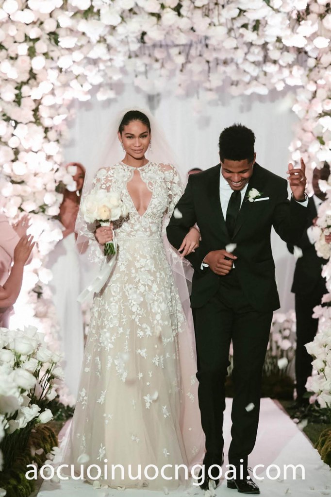 Chân dài đình đám của Victoria’s Secret – Chanel Iman đã diện lên người 2 mẫu thiết kế váy cưới Zuhair Murad trong đám cưới thân mật của mình. Mẫu áo cưới chính với dáng váy chữ A tone màu nude nhạt giúp tôn vinh làn da khoẻ khoắn của cô dâu, xẻ ngực V sâu sexy phối cùng áo choàng capelet để tăng độ trang trọng khi làm lễ. Toàn bộ váy cưới được thêu ren đính kết hạt lãng mạn.