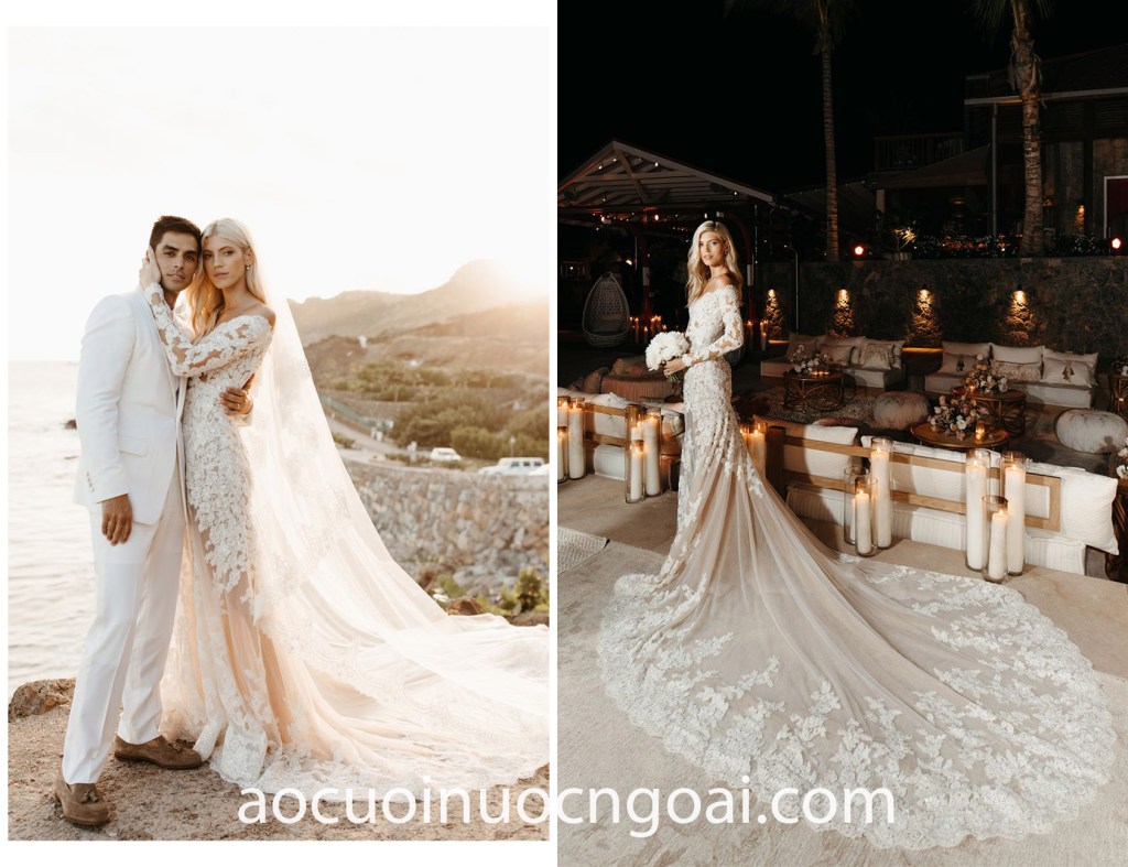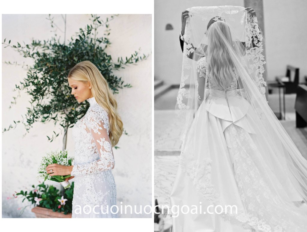 Chiếc váy cưới 2 trong 1 gây ấn tượng với phần áo đuôi cá gợi cảm bên trong có cổ cao cùng tay dài trang trọng, toàn bộ váy được trang trí ren thêu đính kết tỉ mỉ tạo nên sự bắt mắt. Để giúp buổi lễ cưới tại nhà thờ thêm phần lộng lẫy và lịch sự, Zuhair Murad kết hợp thêm tùng váy công chúa làm bằng satin đứng phom có các nếp xếp nhấn eo thon, phía sau xếp tầng bèo phối cùng đuôi ren tạo nên điểm nhấn hút mắt. Cô dâu sử dụng khăn trùm đầu diềm ren dài quét đất để hoàn thiện vẻ ngoài thướt tha, yêu kiều trong ngày cưới.