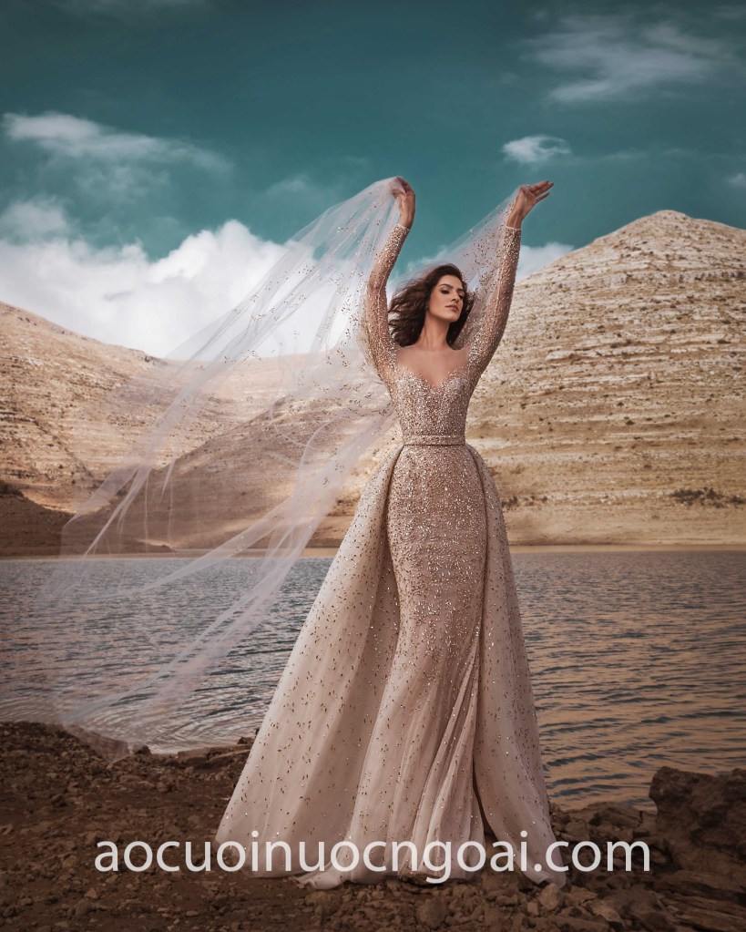 Nổi tiếng trong việc phối hợp màu sắc và chất liệu, thiết kế áo cưới 2 trong 1 màu đồng này sẽ giúp bạn trở thành một nữ thần sắc đẹp với phom váy đuôi cá tôn dáng bên trong, kết hợp cùng tùng váy lưới tháo rời đính kết lấp lánh, công phu.