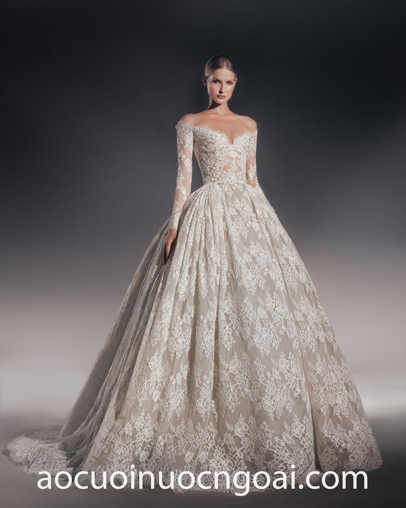 Những cô dâu nữ tính sẽ phải xiêu lòng trước bộ áo cưới công chúa ren Zuhair Murad. Thiết kế váy cưới có tay áo bẹt vai giúp cô dâu khoe khuôn ngực đầy cùng xương quai xanh quyến rũ. Toàn bộ váy cưới được trang trí ren thêu hoa lãng mạn trên nền vải da sành điệu.