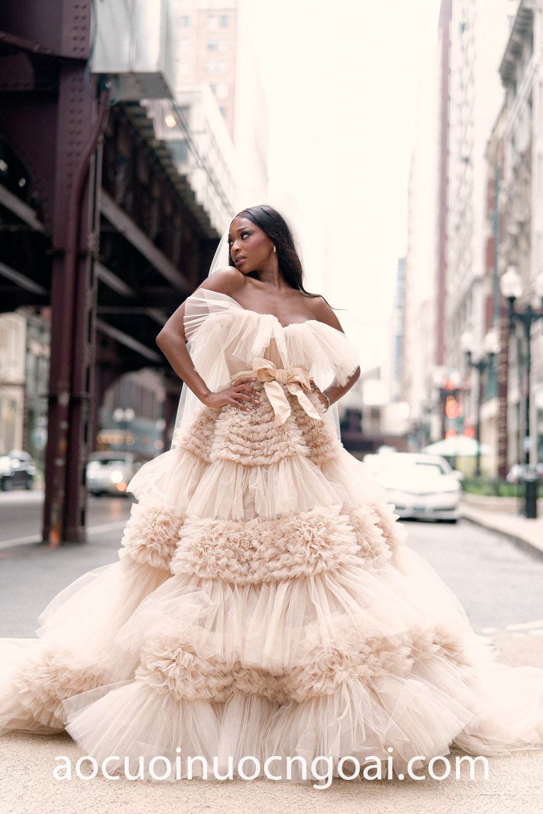 Những cô dâu ưa thích sự khác biệt có thể chọn khoác lên người mẫu áo cưới công chúa xếp bèo tầng thu hút mọi ánh nhìn. Tone màu da cà phê cũng là một yếu tố khiến chiếc váy cưới đặc biệt đứng ngoài số đông, giúp bạn trở thành cô dâu sành điệu dẫn đầu mọi xu hướng.