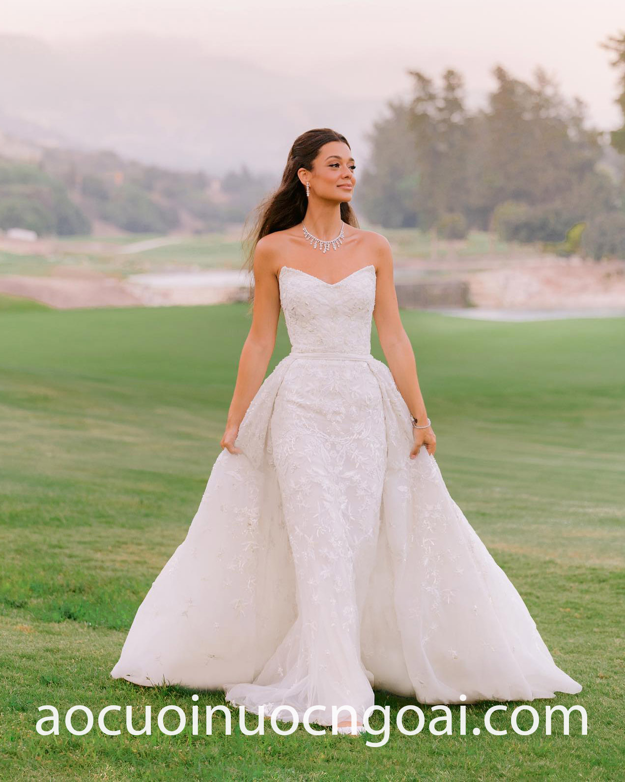 Zuhair Murad vốn nổi tiếng bởi những thiết kế áo cưới 2 trong 1 ấn tượng và đa dụng. Cô dâu diện lên người chiếc váy cưới đuôi cá màu da tay ngắn được trang trí tuyệt đẹp, kết hợp cùng tùng váy có thể tháo rời được trang trí đồng bộ để tạo điểm nhấn ấn tượng.