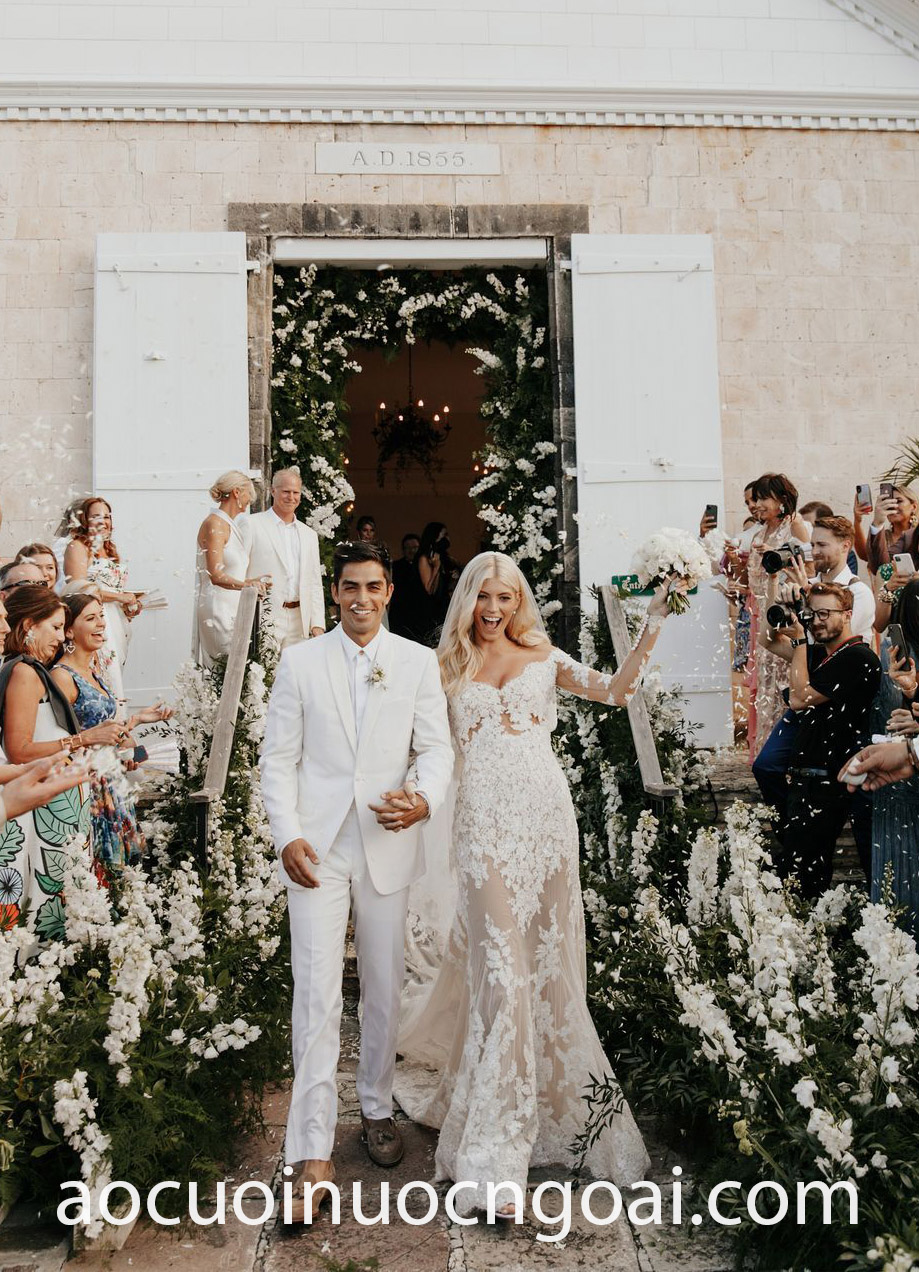 Trong không gian tiệc cưới ngoài trời thân mật, cô dâu xúng xính cùng mẫu váy cưới đơn giản Zuhair Murad với phom dáng chữ A dễ mặc, đồng thời giúp cô dâu trông phần đầy đặn hơn. Thân áo xuyên thấu với lưng hở V sâu gợi cảm được trang trí hoạ tiết hình học tuyệt đẹp.