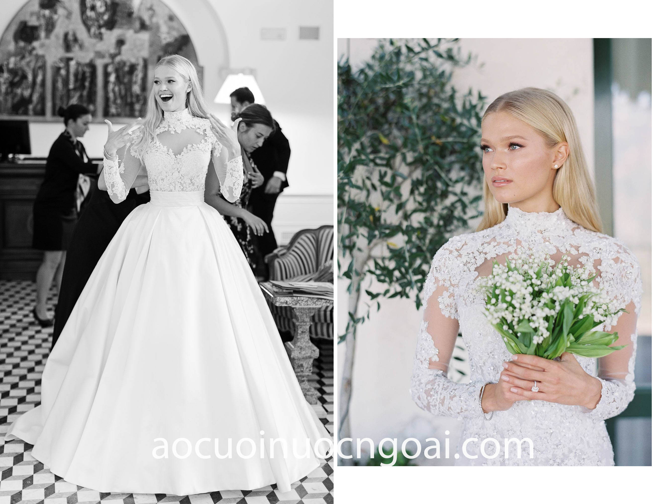 Chiếc váy cưới 2 trong 1 gây ấn tượng với phần áo đuôi cá gợi cảm bên trong có cổ cao cùng tay dài trang trọng, toàn bộ váy được trang trí ren thêu đính kết tỉ mỉ tạo nên sự bắt mắt. Để giúp buổi lễ cưới tại nhà thờ thêm phần lộng lẫy và lịch sự, Zuhair Murad kết hợp thêm tùng váy công chúa làm bằng satin đứng phom có các nếp xếp nhấn eo thon, phía sau xếp tầng bèo phối cùng đuôi ren tạo nên điểm nhấn hút mắt. Cô dâu sử dụng khăn trùm đầu diềm ren dài quét đất để hoàn thiện vẻ ngoài thướt tha, yêu kiều trong ngày cưới.