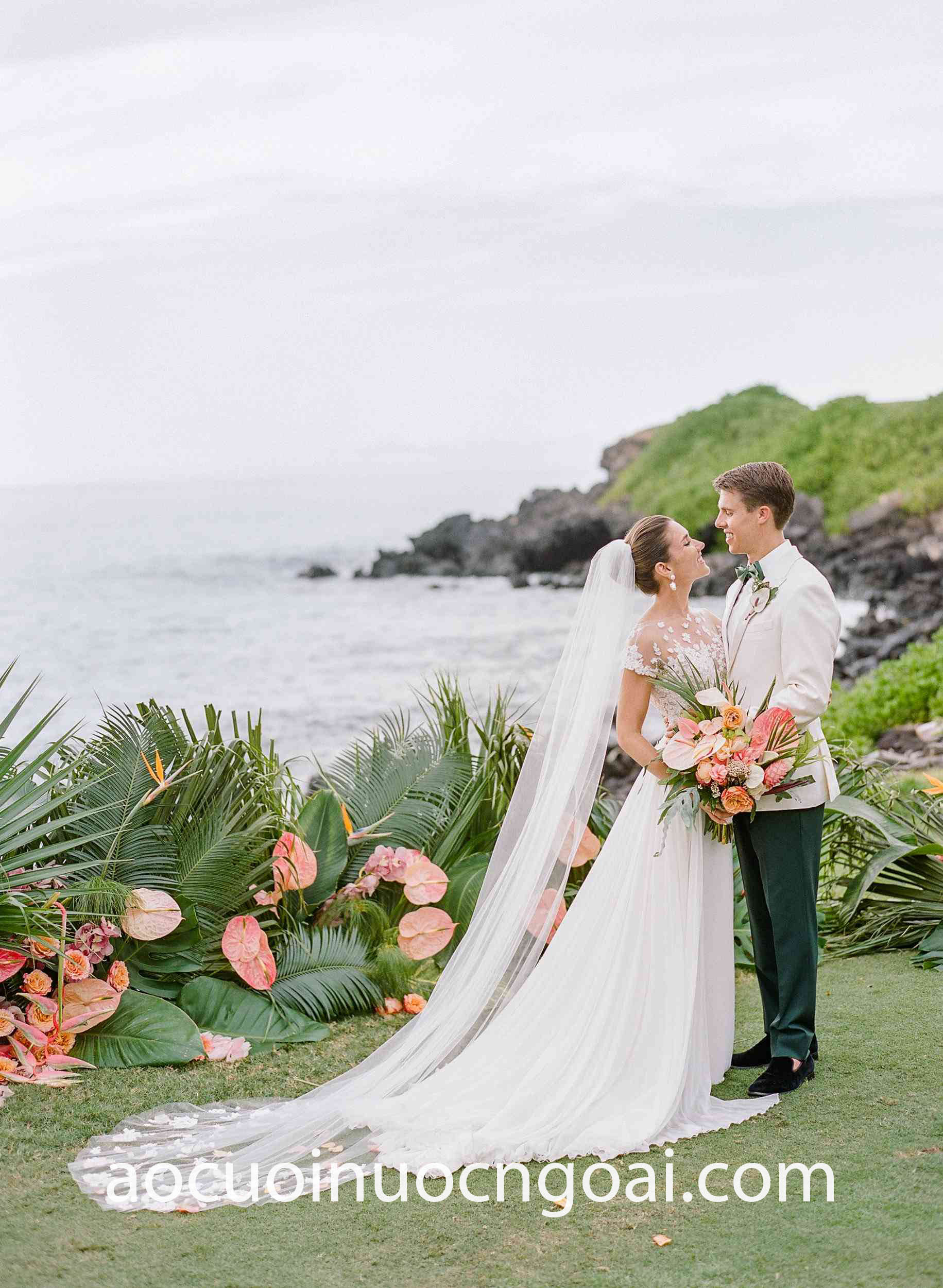 Với concept đám cưới tổ chức ở biển, cô dâu xuất hiện nhẹ nhàng và đầy lãng mạn trong chiếc váy cưới tùng lụa thướt tha của Zuhair. Mẫu váy đơn giản mà đầy tinh tế với những chi tiết trang trí ren ở thân áo, phối cùng khăn voan dài quét đất điểm ren hoa ngọt ngào, rất phù hợp với bầu không khí biển đảo.