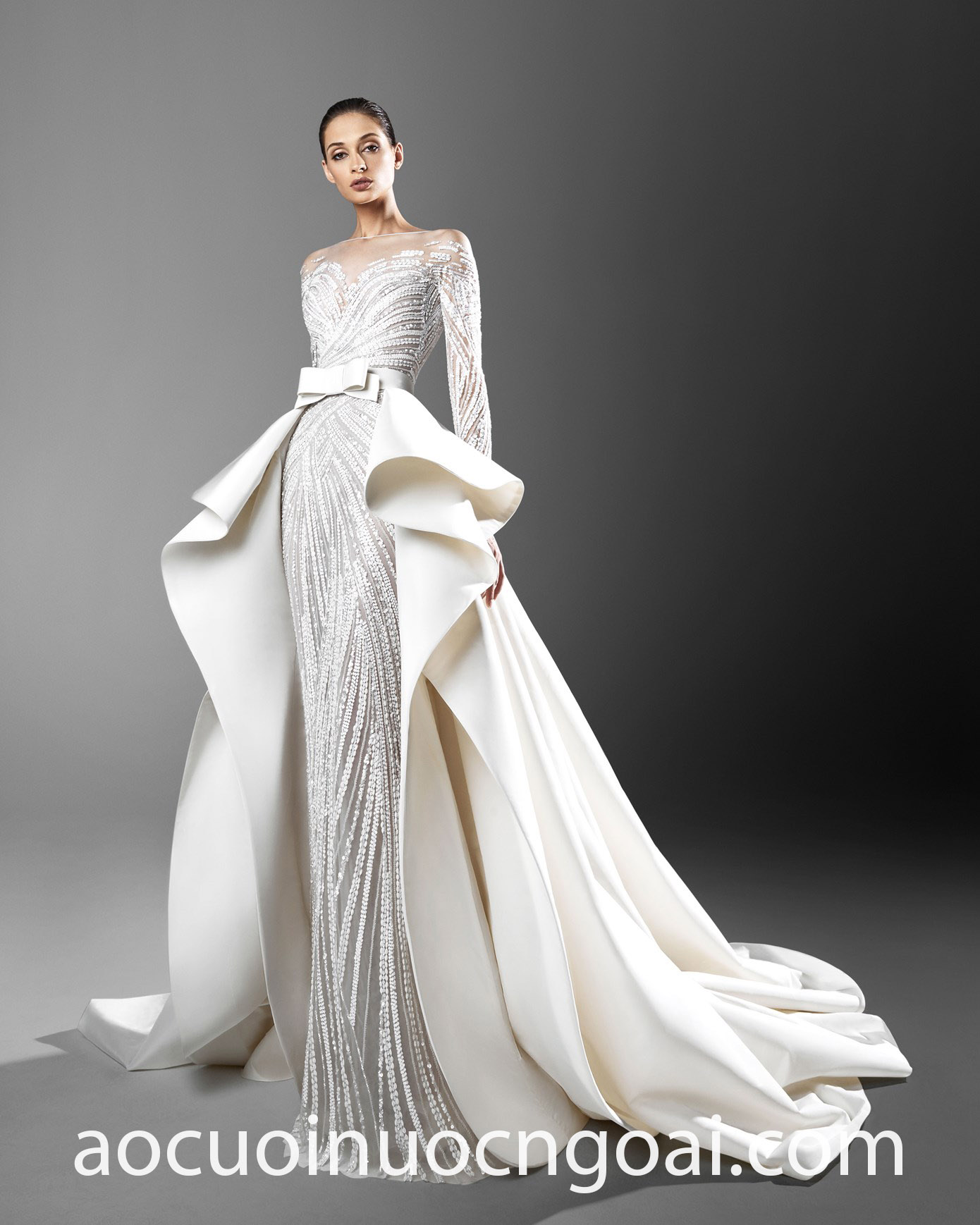 Những mẫu váy cưới Zuhair Murad 2 trong 1 luôn được các cô dâu đón nhận nồng nhiệt. Thiết kế trong mơ với phom váy đuôi cá xuyên thấu trang trí bằng hoạ tiết uốn lượn theo đường cong hấp dẫn của cơ thể. Điểm nhấn đặc sắc là tùng váy satin có thể tháo rời xếp bèo tầng ấn tượng, kết hợp với thắt lưng nơ bản to hợp thời trang.