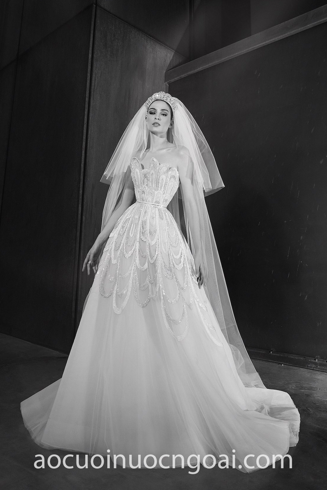 Bên cạnh đó, những mẫu đầm cưới dạ hội Zuhair Murad cũng rất được ưa chuộng. Trong đêm dạ tiệc cưới sôi động, cô dâu khoác lên người bộ cánh xuyên thấu vô cùng ấn tượng với cổ áo trễ vai khoe ngực sexy, thân váy xuyên thấu hoàn toàn được đính kết lấp lánh ánh bạc, kết hợp cùng tùng váy lưới bay bổng rất ăn rơ với phong cách tiệc tùng sang chảnh.