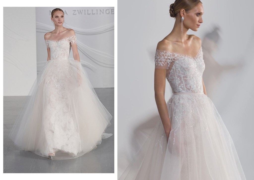 Bộ váy cưới chính thức của Son Ye Jin xuất hiện duyên dáng với cổ áo trễ vai quý phái và hở nửa lưng gợi cảm. Váy cưới được thực hiện trên chất vải lưới bồng bềnh, bay bổng được trang trí hoa văn thêu nổi tinh xảo. Theo chia sẻ độc quyền từ ekip của Son Ye Jin với tờ Naver, đây là mẫu thiết kế đến từ thương hiệu Mira Zwillinger của Isarel đã được nữ diễn viên đình đám lựa chọn giữa hàng loạt cái tên xa xỉ.