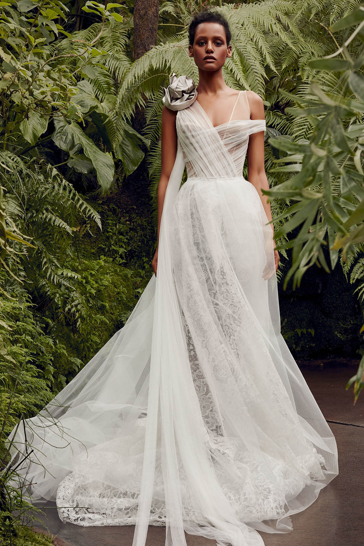 Rất nhanh sau đó, danh tính của chiếc váy cưới cuối cùng cũng đã lộ diện, không ai khác chính là “bà tiên áo cưới” Vera Wang. Mẫu thiết kế độc đáo nằm trong BST cưới xuân hè 2022 xuất hiện lạ mắt với tone màu xanh xám (sage green), cách phối hợp hai chất liệu ren và lưới điệu nghệ giúp chiếc váy trở nên mong manh tựa khói sương. Kết hợp cùng phụ kiện tay áo kết hoa 3D oversize ấn tượng.