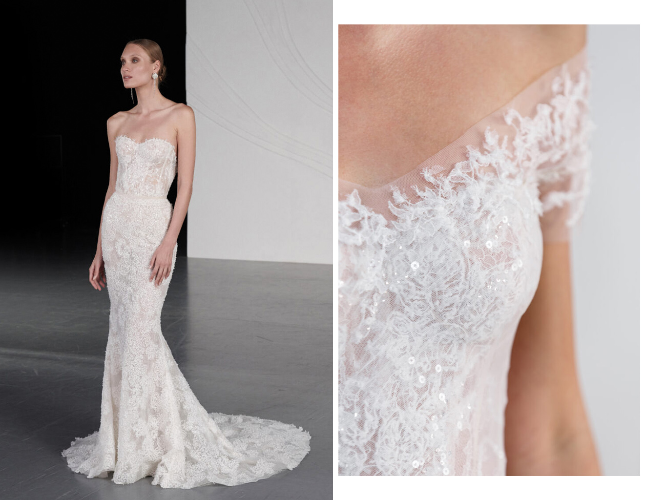 Bộ váy cưới chính thức của Son Ye Jin xuất hiện duyên dáng với cổ áo trễ vai quý phái và hở nửa lưng gợi cảm. Váy cưới được thực hiện trên chất vải lưới bồng bềnh, bay bổng được trang trí hoa văn thêu nổi tinh xảo. Theo chia sẻ độc quyền từ ekip của Son Ye Jin với tờ Naver, đây là mẫu thiết kế đến từ thương hiệu Mira Zwillinger của Isarel đã được nữ diễn viên đình đám lựa chọn giữa hàng loạt cái tên xa xỉ.