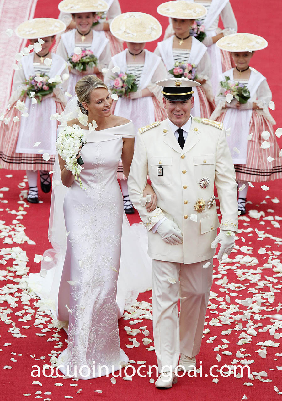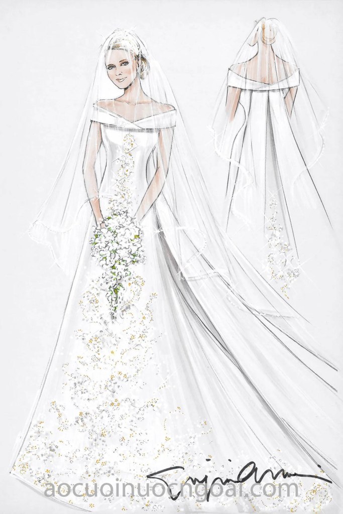 Công chúa Charlene, Thân vương phi Monaco xuất hiện đầy thanh lịch trong một thiết kế áo cưới Haute Couture của thương hiệu đẳng cấp Giorgio Armani. Quá trình may đo thiết kế váy cưới được thực hiện công phu ngay từ bản vẽ phác thảo ý tưởng thiết kế, lựa chọn chất liệu satin thượng hạng đứng form để cho ra dáng váy hoàn hảo, và kết màn bằng những chi tiết đính kết trang trí thật tinh xảo. Tất cả nhằm tôn vinh nét đẹp vương giả, kiêu sa của vị công chúa xinh đẹp nhất xứ Monaco.