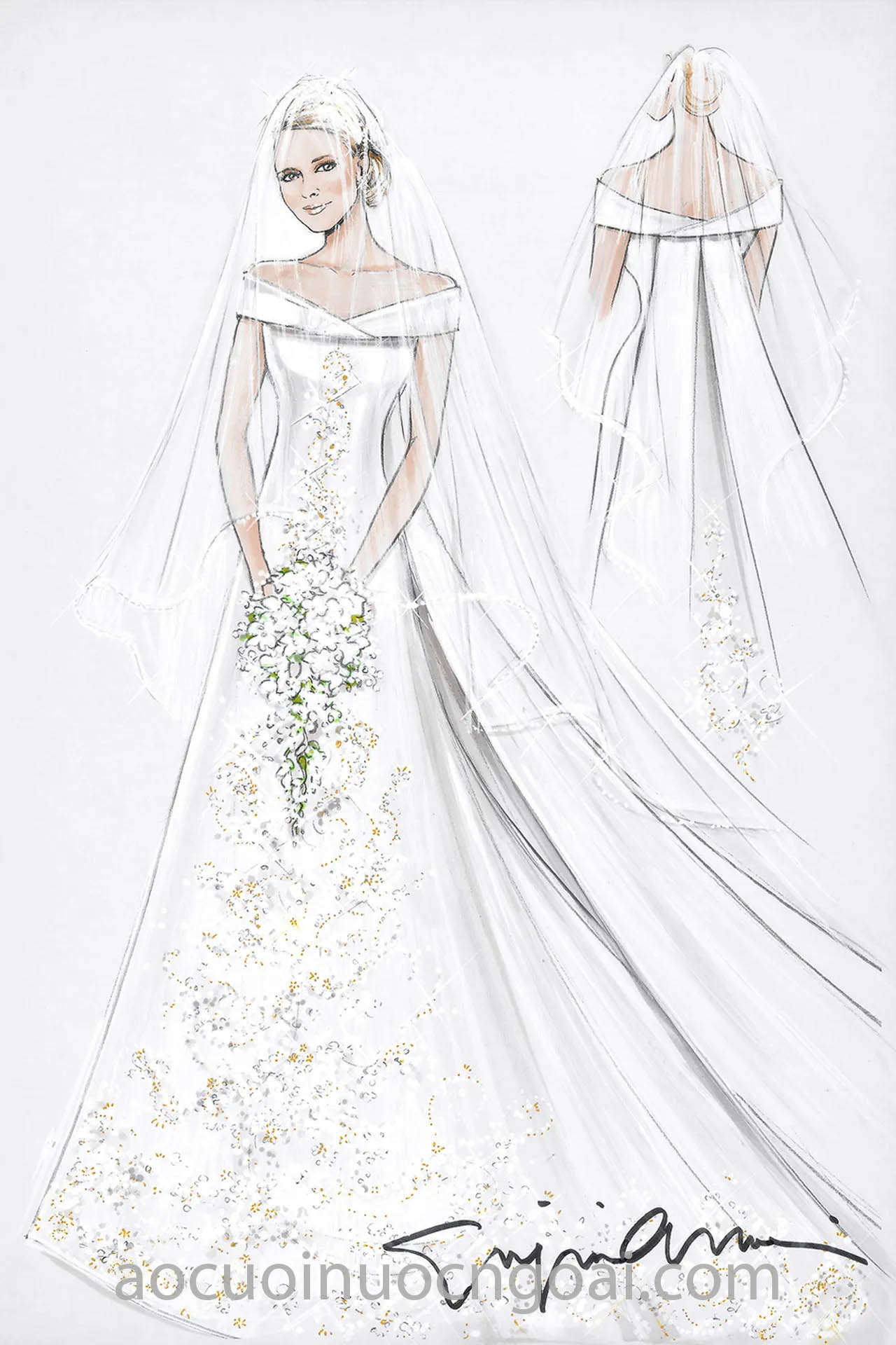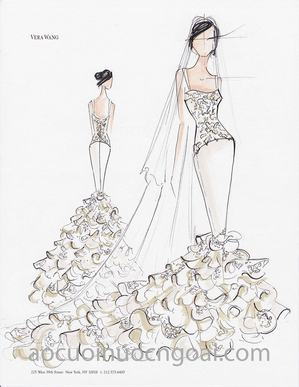 Sau cuộc gặp gỡ đầu tiên, nhà thiết kế sẽ bắt tay vào việc lên ý tưởng và vẽ sketch bản phác thảo váy cưới cho cô dâu lựa chọn (tuỳ vào kiểu dáng và mức độ phức tạp của váy). Sau khi thống nhất thiết kế cuối cùng cũng như hoàn tất việc lựa chọn chất liệu, hãng sẽ tiến hành lấy số đo và thực hiện lên rập, dựng form theo chuẩn cơ thể của cô dâu.