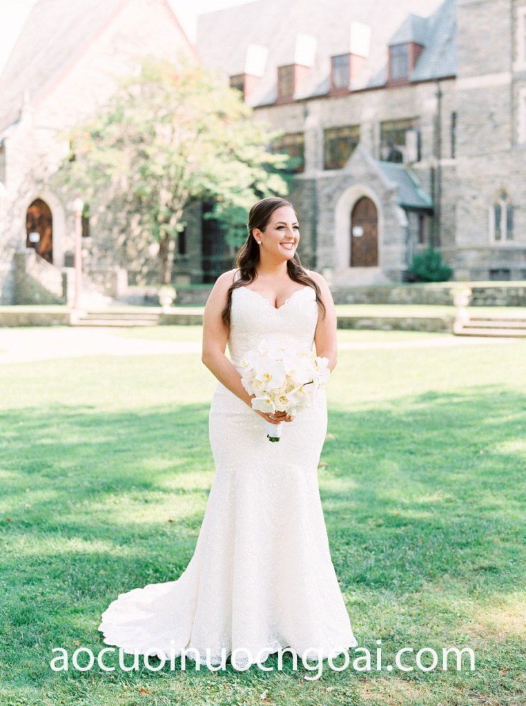Cô dâu mập mạp có thể hoàn toàn tự tin khi diện lên người chiếc áo cưới đuôi cá big size với hoạ tiết ren nhỏ, thanh mảnh và đan xen nhịp nhàng với nhau, góp phần tạo nên hiệu ứng đường cong gợi cảm đầy lôi cuốn.
