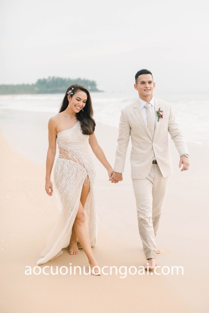 Bữa tiệc cưới thân mật trên biển sẽ càng thêm ấn tượng với bộ váy cưới đuôi cá xẻ tà thiết kế riêng độc đáo. Cô dâu khoe trọn lợi thế hình thể quyến rũ trong chiếc áo cưới đuôi cá lệch vai đính kết lấp lánh, phá cách cùng đường cut-out lượn theo vòng eo thon thả và khoe trọn đôi chân nuột nà với chi tiết xẻ tà cao táo bạo. Tone màu da pastel của váy thật hoàn hảo giữa không gian cát vàng biển xanh tuyệt đẹp của vùng nhiệt đới.