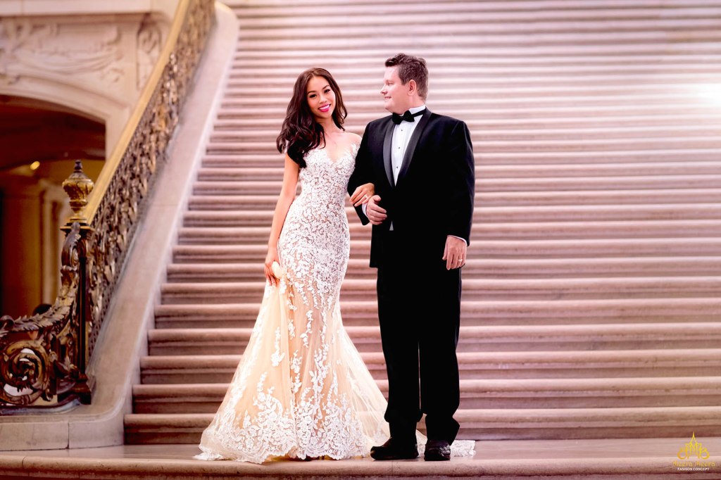 Đặt may áo cưới riêng giúp bạn có thể tự do lựa chọn màu sắc váy cưới mà mình mong muốn để ngày cưới thêm phần sắc màu. Mẫu áo cưới đuôi cá màu da custom nhà Meera Meera đã giúp cô dâu khoe trọn sắc vóc nuột nà giữa không gian sang trọng tại Toà thị chính San Francisco. Chất vải lưới màu da nổi bật, nhẹ nhàng ôm sát đường cong gợi cảm của cô dâu, kết hợp cùng hoạ tiết ren thêu thủ công đặc sắc tôn vinh trọn vẹn vẻ đẹp tươi trẻ của cô dâu thời thượng.