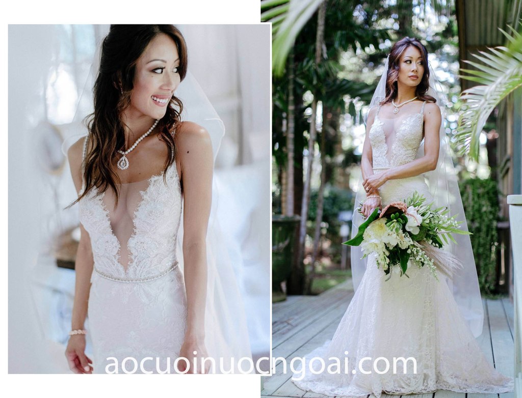 Chất liệu ren là sự lựa chọn hoàn hảo cho kiểu váy cưới đuôi cá vốn đã rất gợi cảm. Chiếc áo cưới đuôi cá ren nổi bật với cổ áo 2 dây xẻ ngực sâu vô cùng táo tạo, đính kết bắt mắt đã giúp cô dâu khoe trọn vòng một căng tròn sexy, cố định vòng eo với thắt lưng đính ngọc trai và trải dài tầm mắt với chân váy đuôi cá ren xoè lãng mạn.