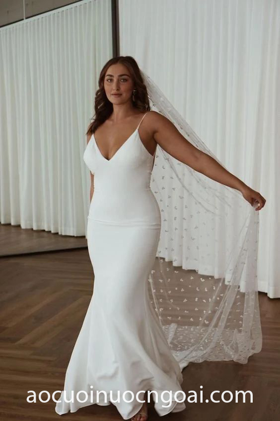 Cô dâu mũm mĩm ưa thích phong cách đơn giản có thể lựa chọn cho mình chiếc váy cưới đuôi cá big size minimalist. Chất liệu satin hay lựa trơn đều hoạt động tốt nếu được may đo theo chuẩn vóc dáng của riêng bạn.