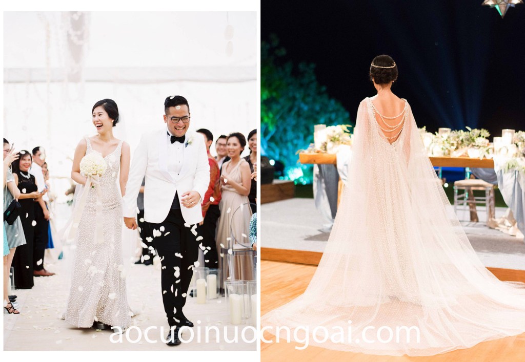 Trong những không gian tiệc cưới sum vầy ấm cúng, hãy chọn cho mình một chiếc váy cưới đuôi cá dạ tiệc để giúp bạn thoải mái nhất suốt cả ngày dài. Phần thân trên ôm vừa vặn và chân váy không quá bó chân sẽ giúp bạn dễ dàng di chuyển mà vẫn thật quyến rũ. Bạn cũng có thể kết hợp thêm phụ kiện áo choàng cape để tăng thêm vẻ trang trọng, quý phái trong đêm dạ tiệc nhé.