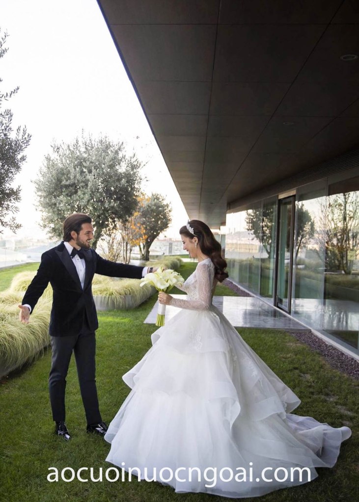 Áo cưới xếp tầng thiết kế riêng dễ dàng mang đến cho bạn vẻ ngoài đẹp như cổ tích theo mong muốn của riêng bạn. Chiếc áo cưới công chúa thông thường sẽ trở nên đầy thơ mộng khi bạn ứng dụng kiểu váy xếp từ 3 tầng trở lên, và càng lãng mạn hơn khi bạn kết hợp cùng chất liệu ren Chantilly tinh tế chạy trên cổ áo và tay dài để tăng thêm sự trang trọng.