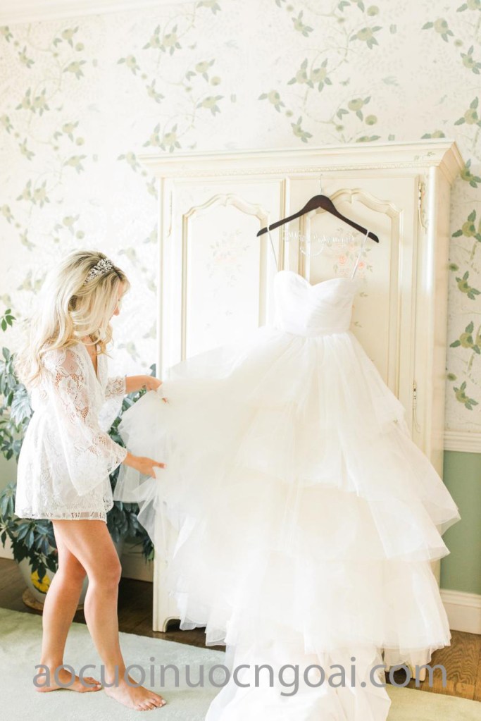 Với những cô dâu ưa thích phong cách lãng mạn ngọt ngào, một chiếc áo cưới xếp tầng thiết kế riêng theo yêu cầu sẽ giúp bạn có thể thoải mái lựa chọn kiểu dáng, màu sắc, chi tiết trang trí mà mình yêu thích. Mẫu váy cưới xếp tầng custom sẽ càng thêm duyên dáng khi bạn sử dụng hoạ tiết ren thêu đủ màu sắc để chiếc váy cưới trở nên tràn đầy sức sống tươi mới.