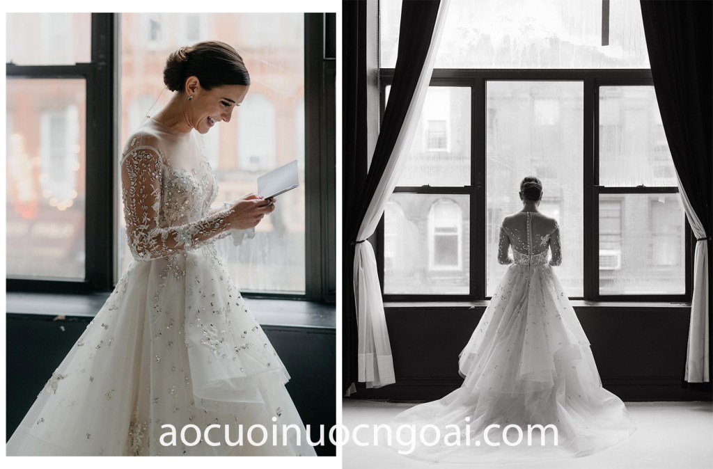 Trong những lễ cưới phong cách trang trọng hoặc tổ chức tại nhà thờ, váy cưới xếp tầng tay dài vừa giúp cô dâu đảm bảo được tính chất thanh lịch trong lễ cưới, lại đầy nổi bật với tùng váy xếp một tầng được đính kết lấp lánh thu hút mọi ánh nhìn.
