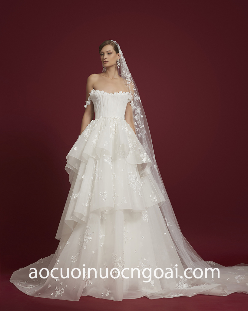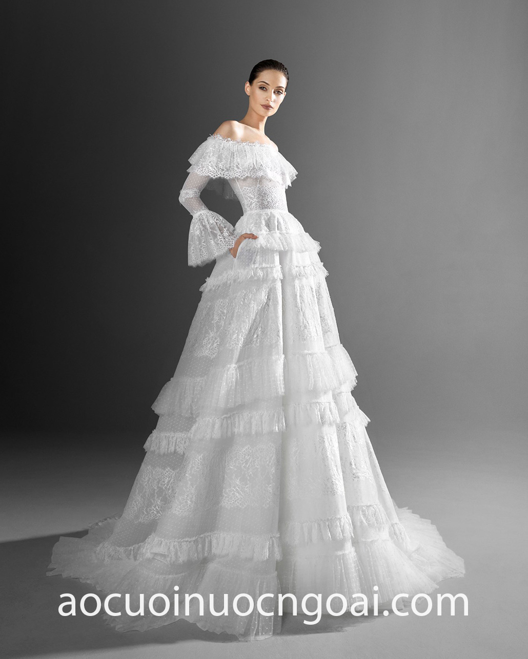 Nếu bạn là một cô dâu ưa thích sự nữ tính gợi cảm, kiểu áo cưới xếp tầng trễ vai sẽ là lựa chọn lý tưởng giúp bạn khoe trọn xương quai xanh tuyệt đẹp cùng khuôn ngực căng đầy. Trong khi đó tùng váy xếp 3 tầng trang trí hoa ren thêu lấm tấm sẽ mang đến cho bạn nét quyến rũ khó thể chối từ.