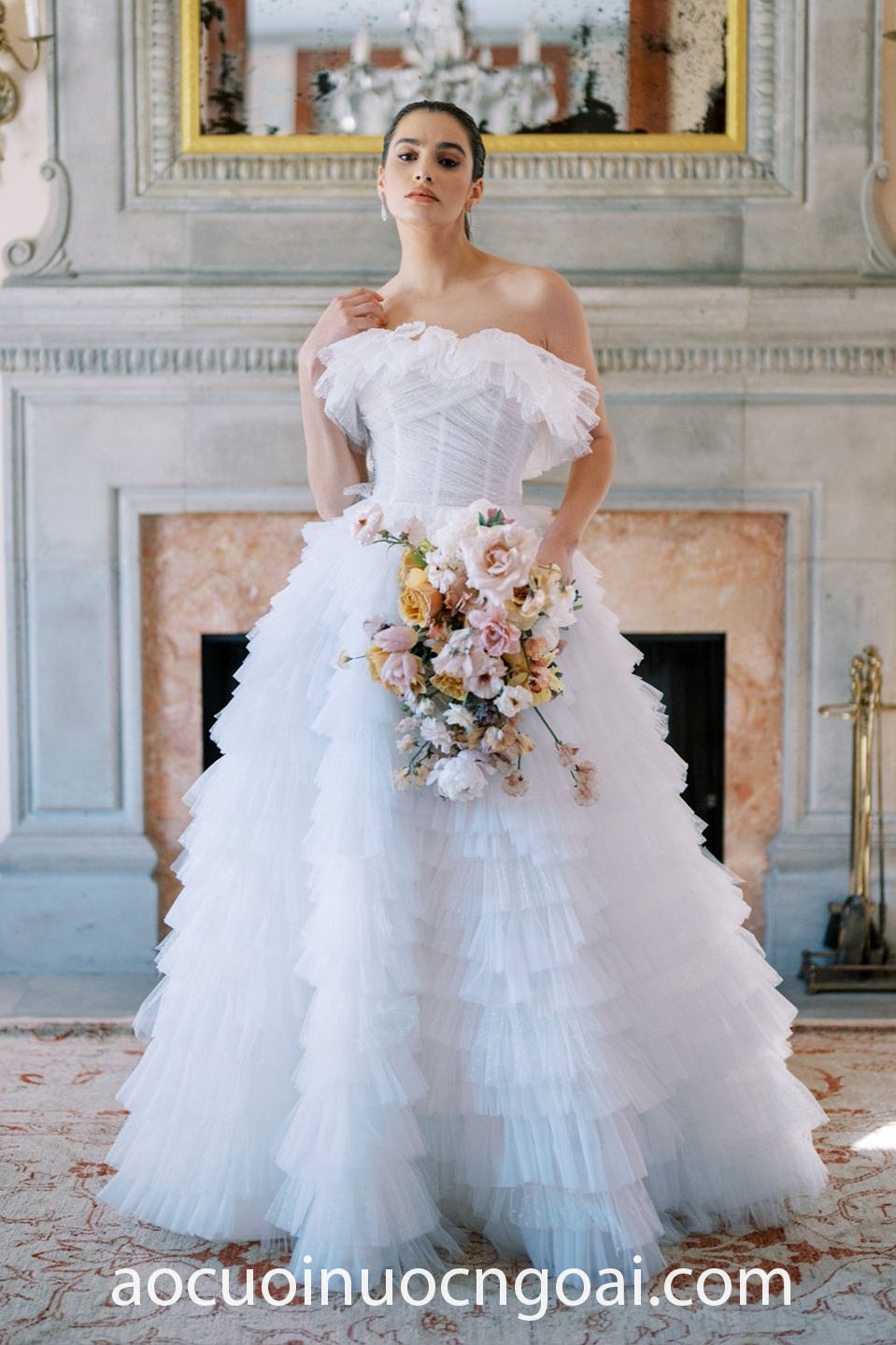Với những cô dâu sành điệu ưa thích phong cách nữ tính điệu đà, áo cưới xếp tầng sẽ là gợi ý lý tưởng để bạn có thể mang đến vẻ ngoài đầy lãng mạn cho ngày trọng đại nhất cuộc đời, khiến bất kỳ ai cũng đều phải trầm trồ trước gu thời trang của bạn.