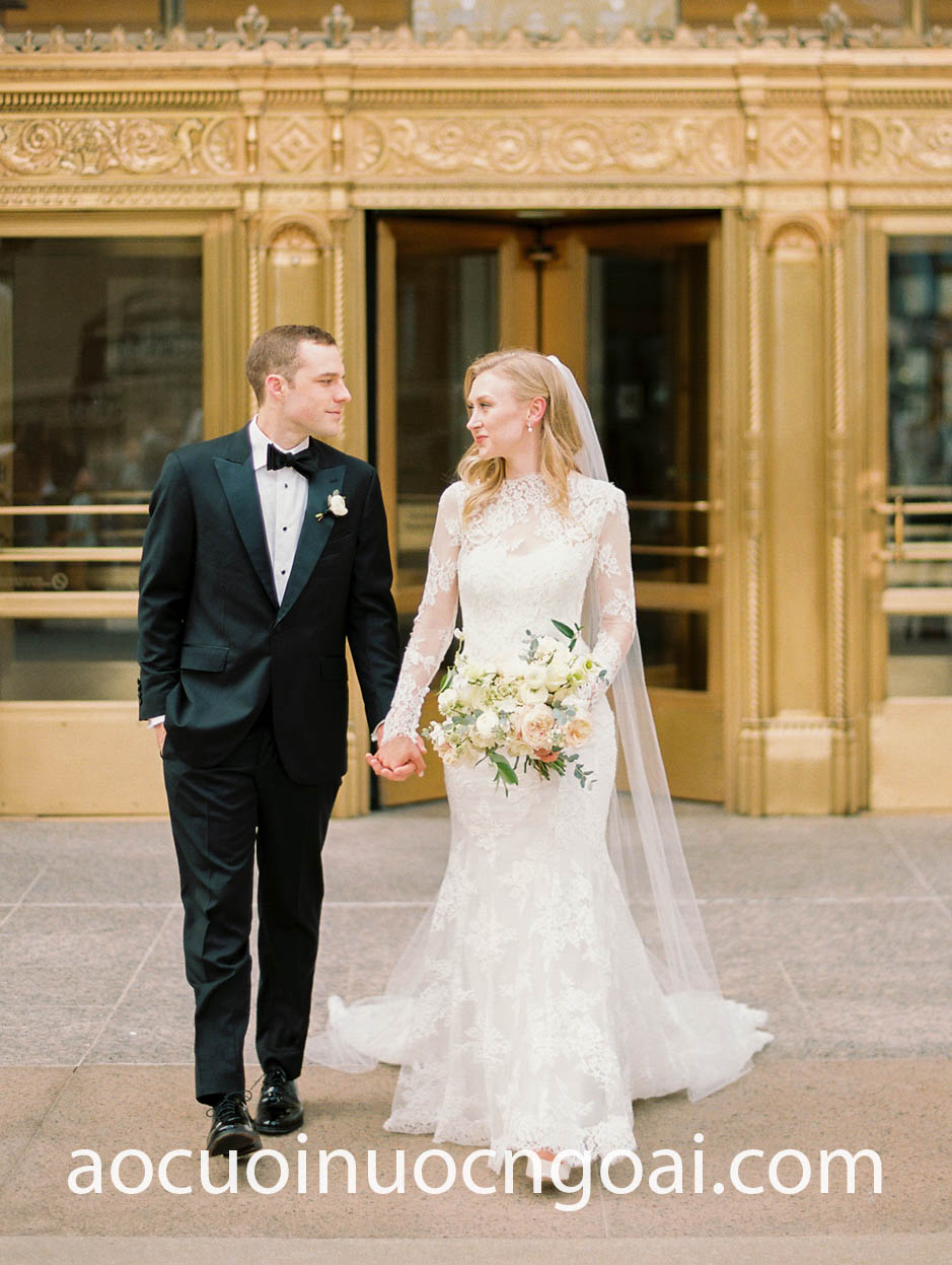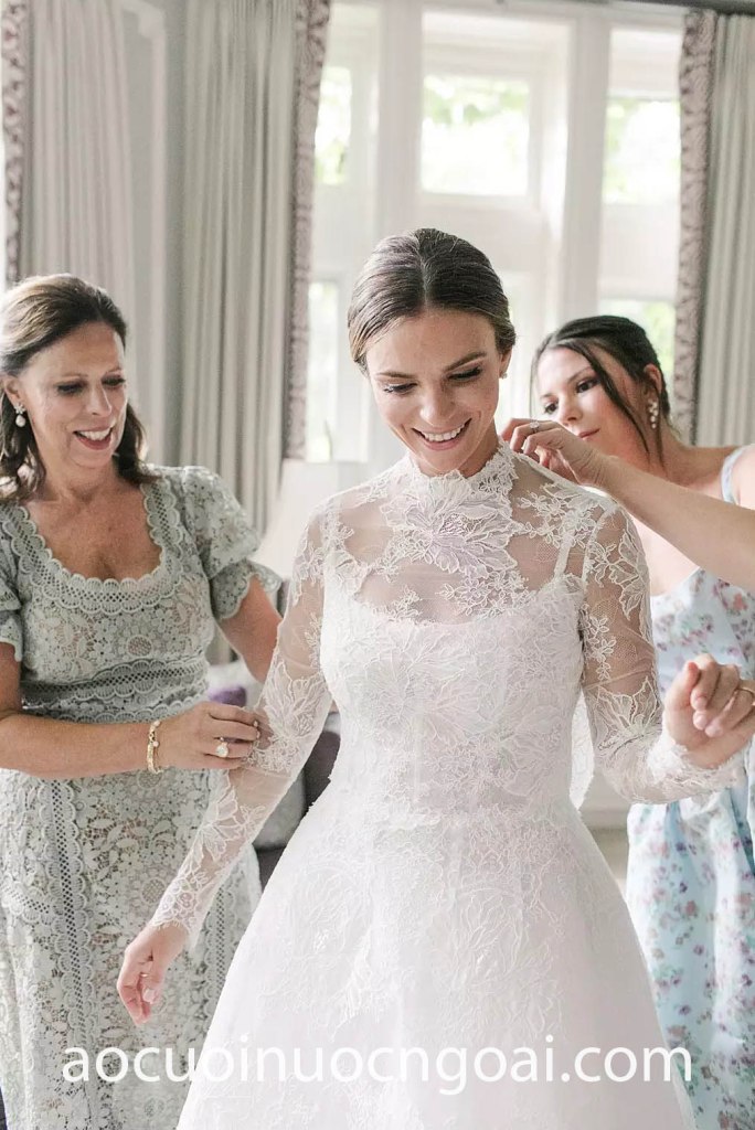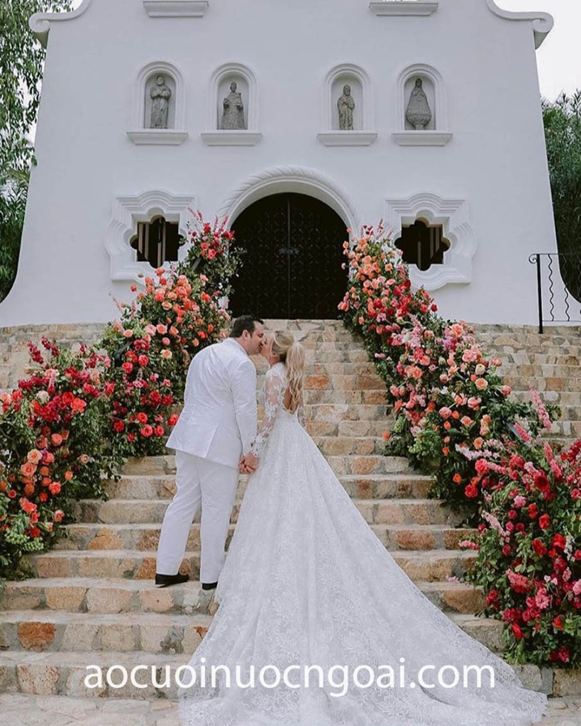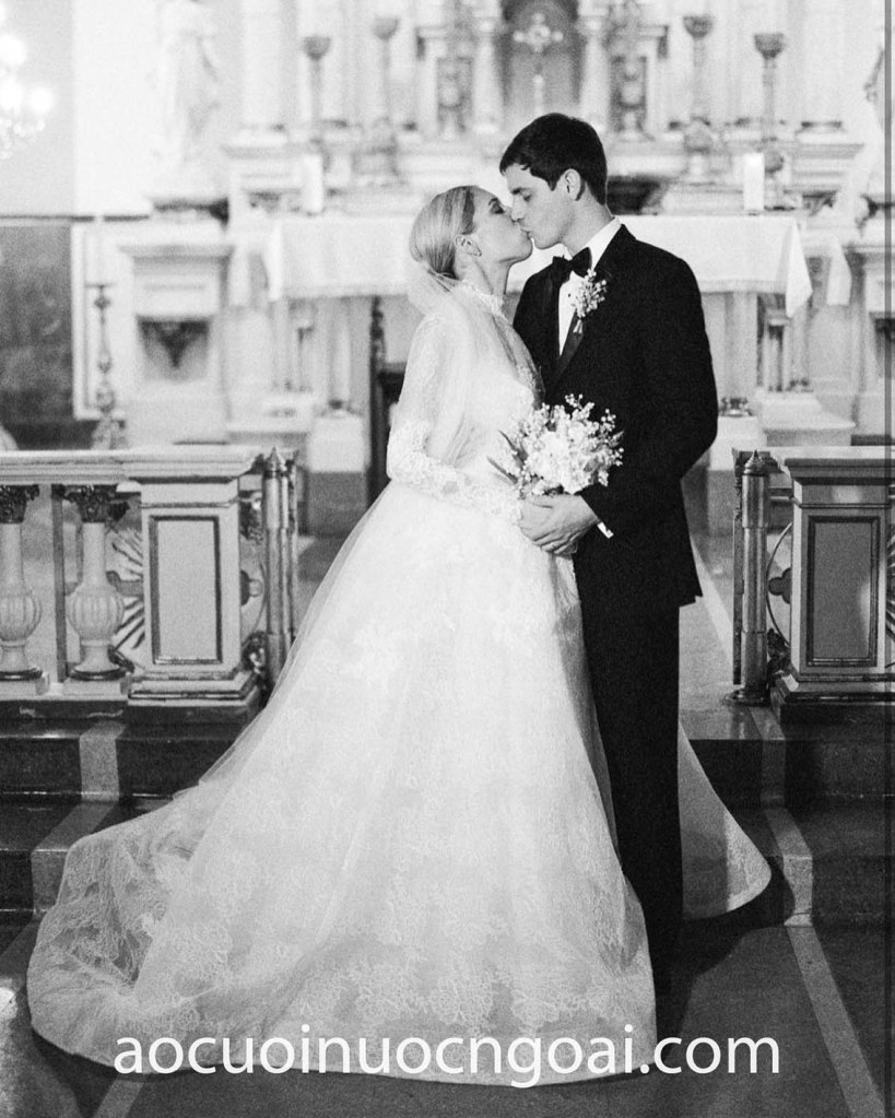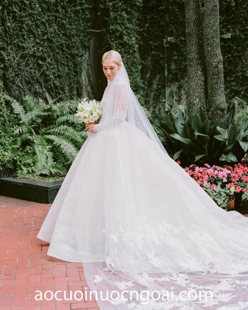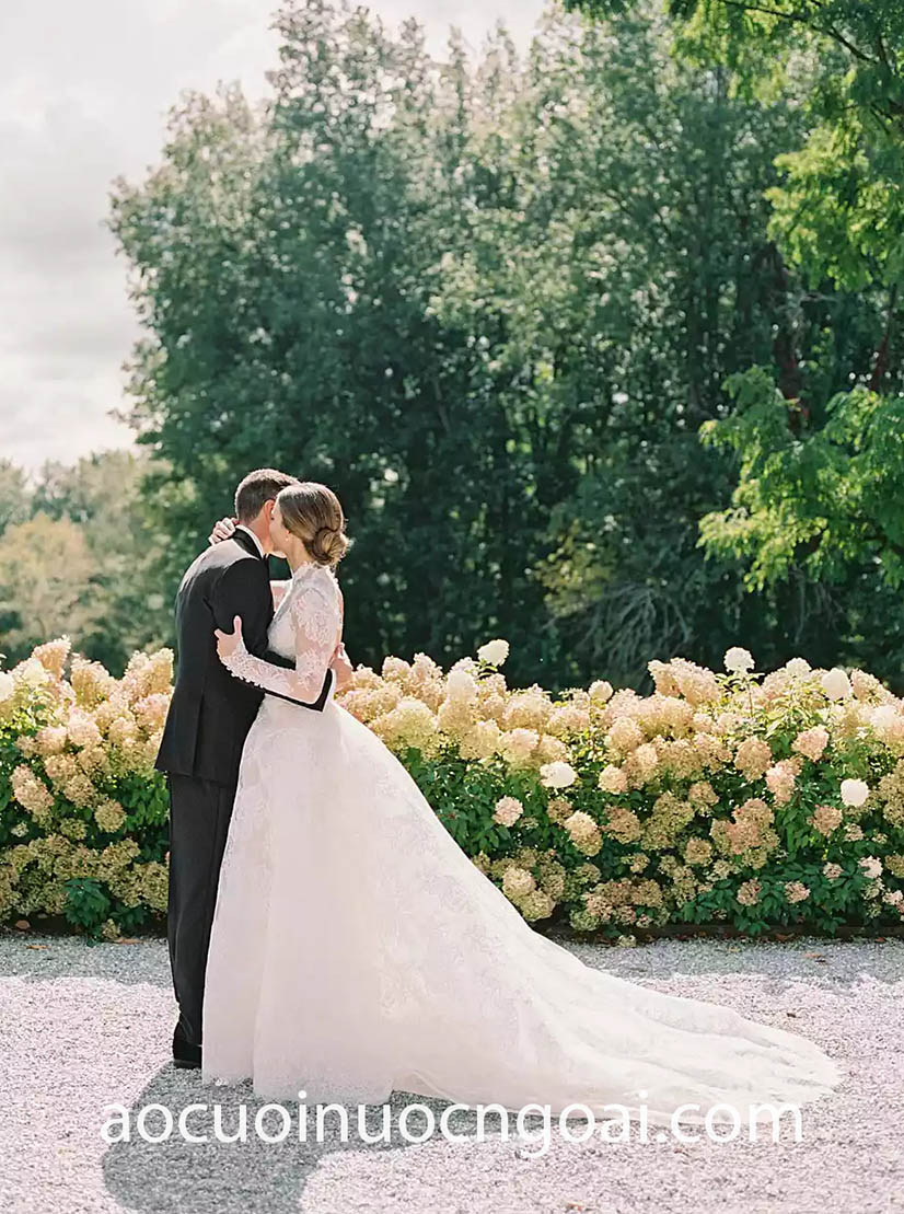 Trong khi đó, áo cưới ren Chantilly tay dài với cổ cao thanh lịch cùng tùng váy xoè dài thướt tha sẽ là lựa chọn hoàn hảo cho những đám cưới tổ chức trong Nhà thờ thiêng liêng.