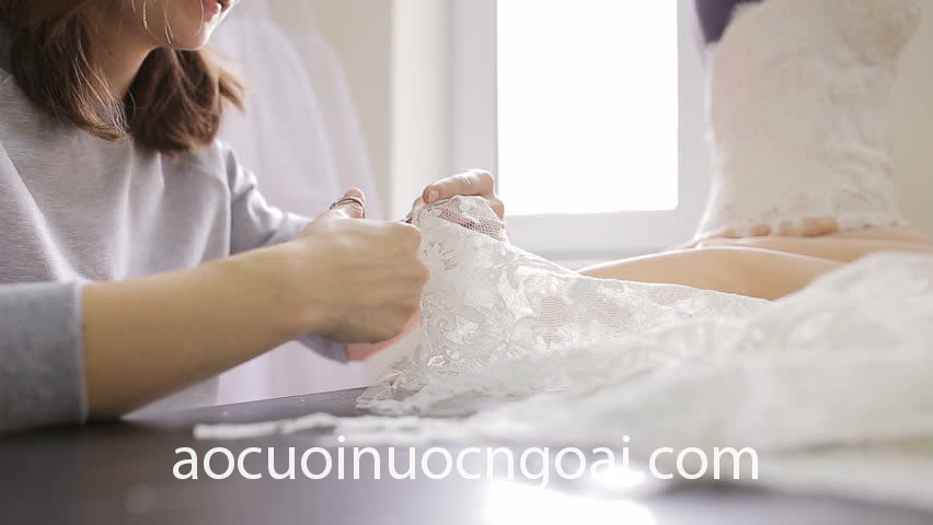 Kế đến, nhà mốt áo cưới cao cấp sẽ tiến hành dựng form sắc nét dựa trên số đo chính xác của bạn. Công đoạn trang trí được thực hiện thủ công và giám sát chặt chẽ bởi đội ngũ thiết kế chuyên nghiệp, tạo nên những điểm nhấn bắt mắt và đầy tinh tế.