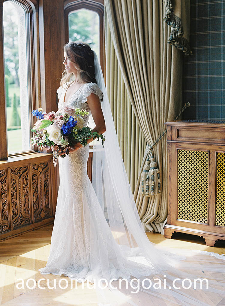 Áo cưới ren Chantilly cao cấp với tay áo ngắn thoải mái cùng tùng váy chữ A xoè nhẹ nhàng rất thích hợp cho những lễ cưới tổ chức theo phong cách trang trọng.