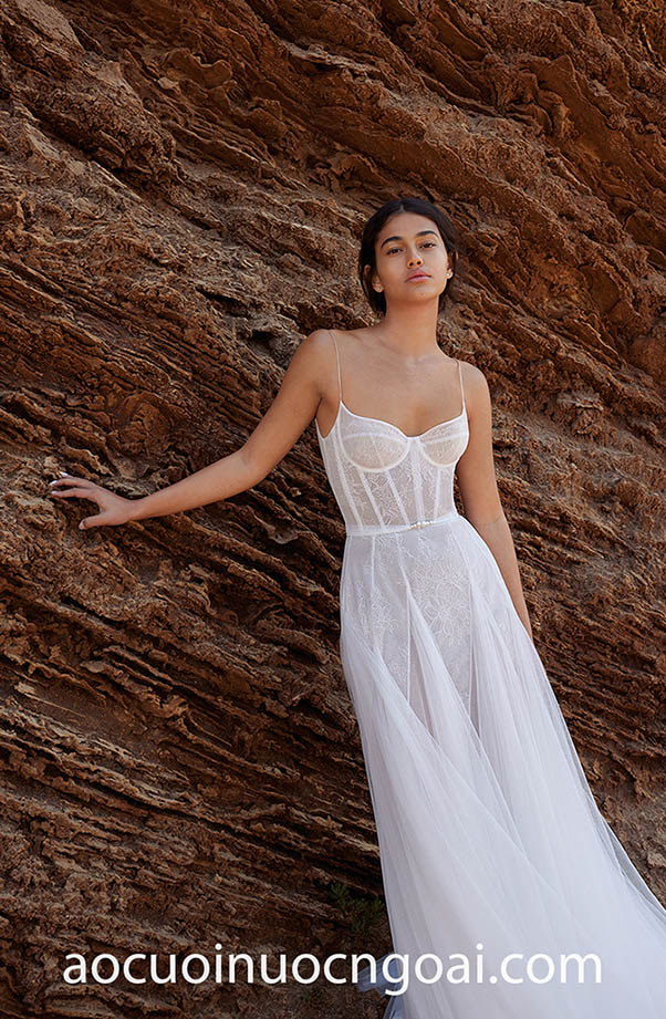 Với đặc tính mỏng manh, ren Chantilly đặc biệt thích hợp cho những kiểu áo cưới gợi cảm. Váy cưới 2 dây ren Chantilly là lựa chọn ưa thích của những cô dâu theo đuôi phong cách quyến rũ mà thật thoải mái với thân áo corset siết eo nâng ngực tự nhiên, đi cùng tùng váy xoè xuyên thấu sexy.