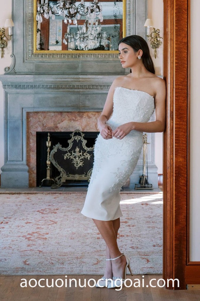 Hoặc như mẫu áo cưới ngắn satin với phom váy ôm gọn cơ thể, điểm xuyết bằng hoạ tiết ren hoa lá sinh động sẽ giúp hoàn thiện vẻ ngoài sành điệu, duyên dáng của một cô dâu hiện đại. Rất phù hợp cho những buổi tiệc cưới thân mật, hoặc dùng làm váy cưới thứ hai để tiếp đón quý quan khách.