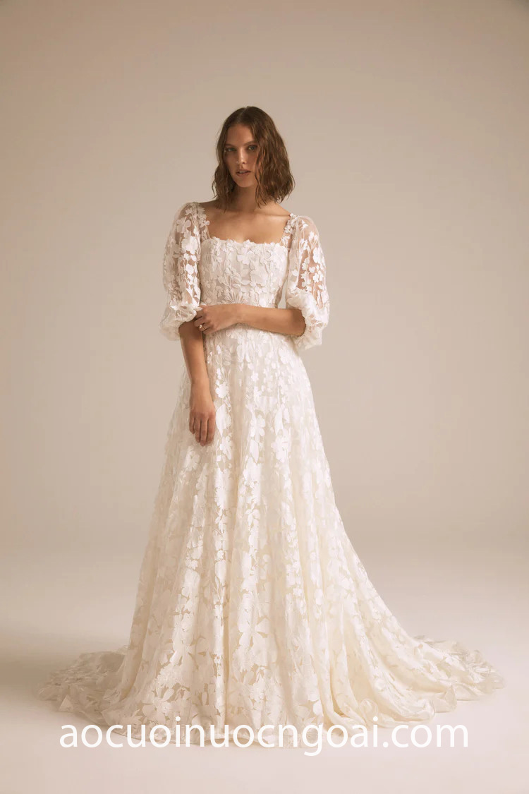 Với những cô dâu ưa thích phong cách thời trang nữ tính, lãng mạn: váy cưới tay phồng ren có sự đa dạng các kiểu hoạ tiết, đi cùng tay áo phồng sẽ càng giúp gia tăng vẻ ngoài thơ mộng cho bạn.