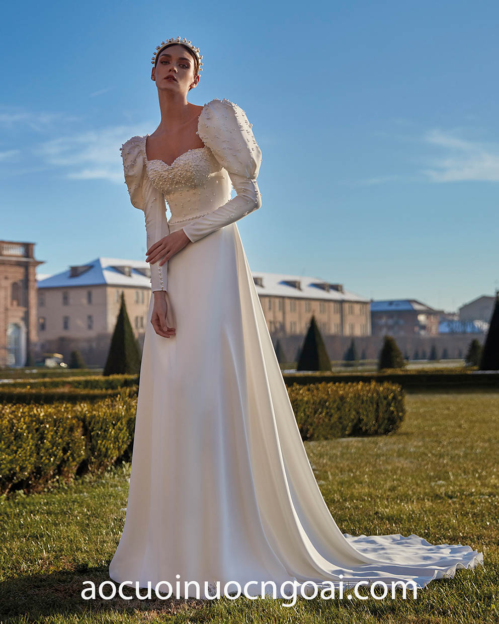 Cô dâu tổ chức đám cưới mang tính chất trang trọng có thể diện lên người mẫu áo cưới tay dài phồng, vừa đảm bảo tính chất lịch thiệp của lễ cưới, đồng thời tạo nên điểm nhấn ấn tượng trong mắt mọi quan khách.