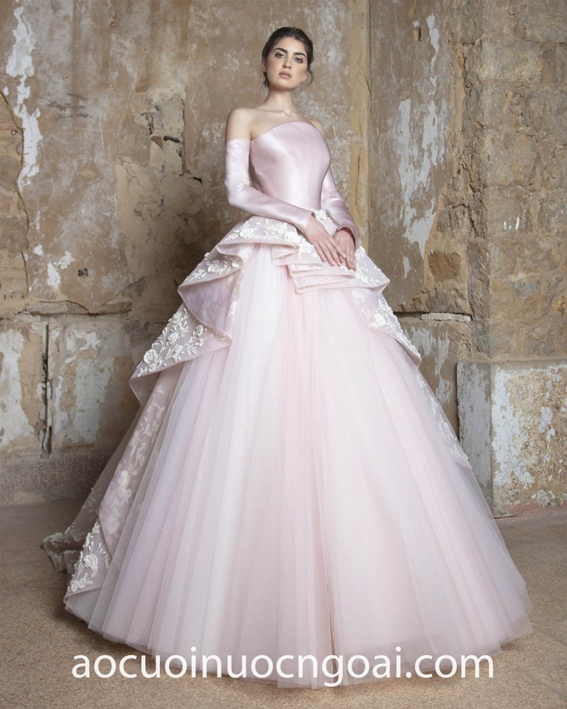Áo cưới màu hồng thường mang ý nghĩa cho sự tinh khôi, ngọt ngào và hạnh phúc, chính vì thế luôn nhận được sự yêu thích của phái đẹp. Ngày nay, những chiếc váy cưới màu hồng ngày càng đa dạng về kiểu dáng, chất liệu và màu sắc,… giúp cô dâu có thêm rất nhiều sự lựa chọn để đám cưới thêm phần đặc biệt.