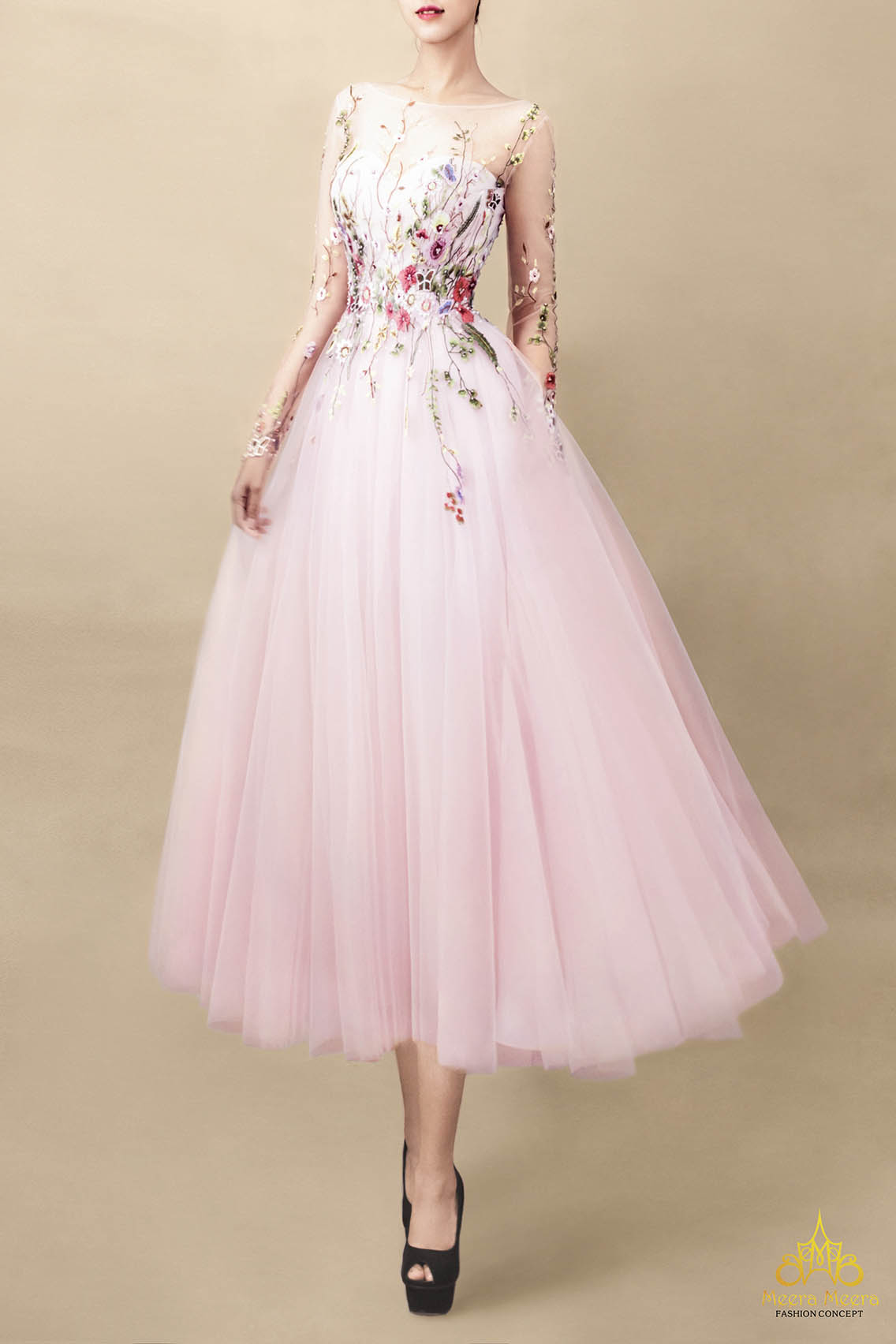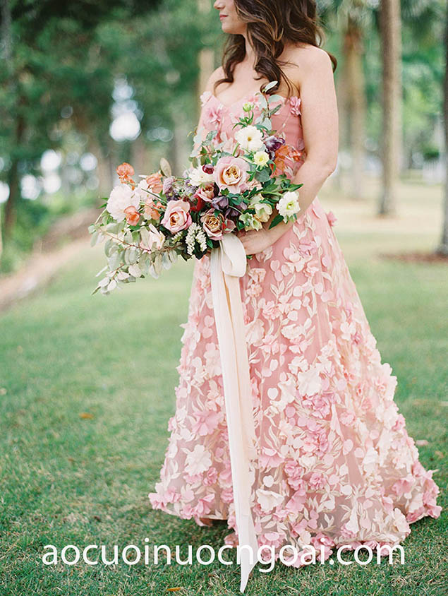 Hoặc bạn sẽ càng thêm nổi bật với kiểu đầm cưới màu hồng đính hoa 3D, một sự lựa chọn lý tưởng cho những đám cưới sân vườn tổ chức vào mùa xuân hè.