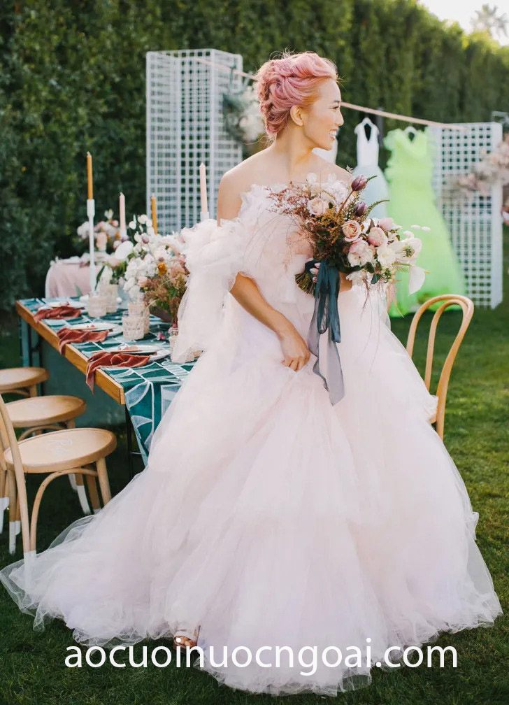 Áo cưới chữ A tùng lưới màu hồng là một trong những item luôn được mọi cô dâu ưa thích, bởi tính chất tiện dụng, dễ di chuyển và phù hợp với hầu hết các dáng người.