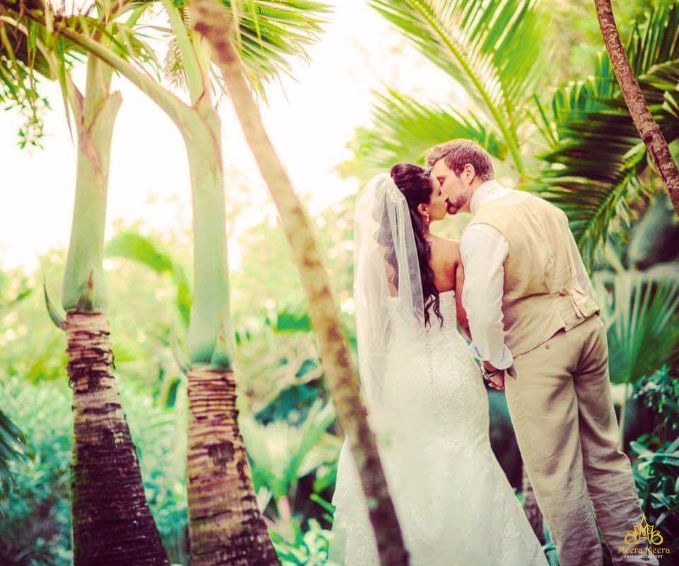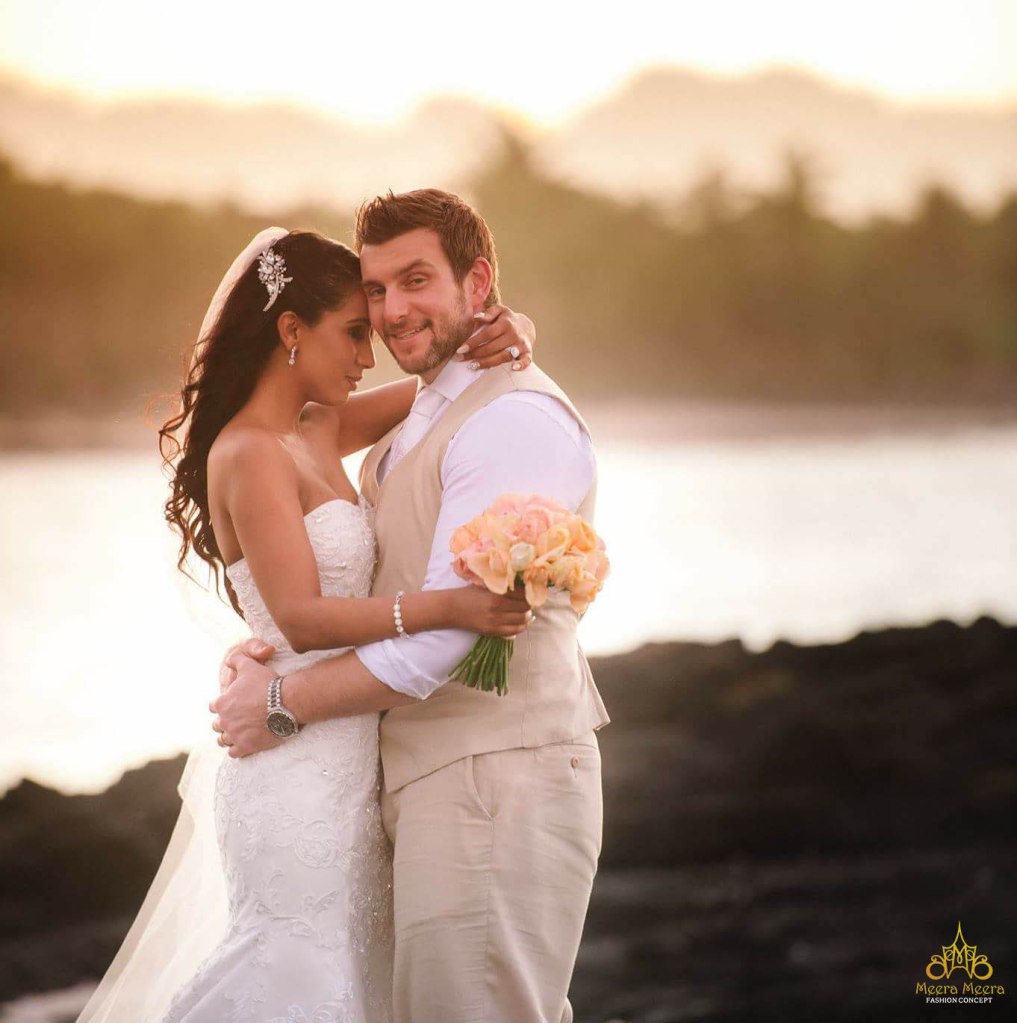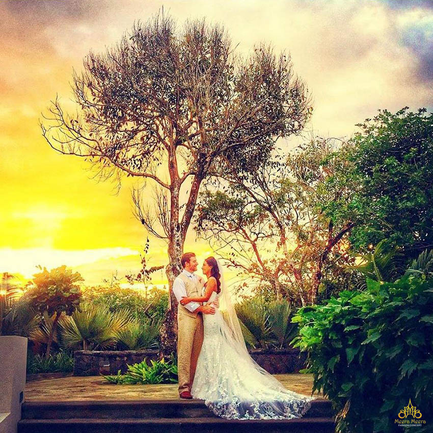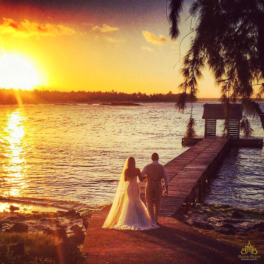 Ánh chiều hoàng hôn buông xuống tuyệt đẹp trên vùng biển vắng ở đảo quốc Mauritius, cặp đôi Eshanee & Ben đam mê du lịch xuất hiện rạng ngời trong từng khung hình đẹp tựa như những thước phim. Cô dâu diện lên người chiếc váy cưới đuôi cá thêu ren đến từ thương hiệu nổi tiếng Meera Meera Fashion Concept. Thiết kế cúp ngực tim tôn trọn vòng một căng tràn sức sống cùng làn da nâu khoẻ khoắn của cô dâu, phom dáng ôm vừa vặn tôn vinh vóc dáng đồng hồ cát, đồng thời vẫn giữ độ thoải mái trong di chuyển và kết thúc bằng đuôi váy ren xoè dài, tô điểm thêm nét lãng mạn cho bầu không khí đã quá đỗi thân mật tại khu resort cao cấp nơi đảo quốc xa xôi.
