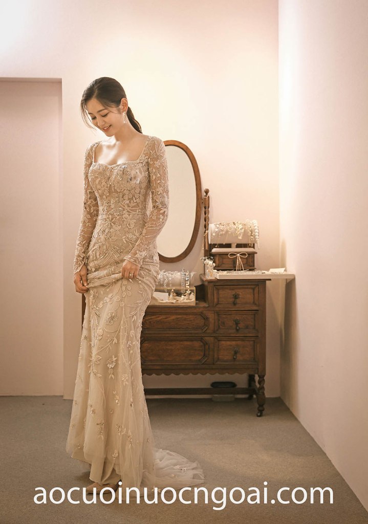 Điểm nhấn cho bộ ảnh trong trẻo này là chiếc váy cưới đuôi cá Meera Meera mà cô dâu tin chọn đặt may cho riêng mình, nổi bật với thân áo xuyên thấu hoàn toàn, đính kết ren đầy nữ tính và mở ra khoảng lưng hở nõn nà. Tùng váy lụa là ôm gọn body gợi cảm cùng chiếc đuôi xoè tròn thu hút sự chú ý vào nét đẹp mỹ miều của cô dâu sành điệu.