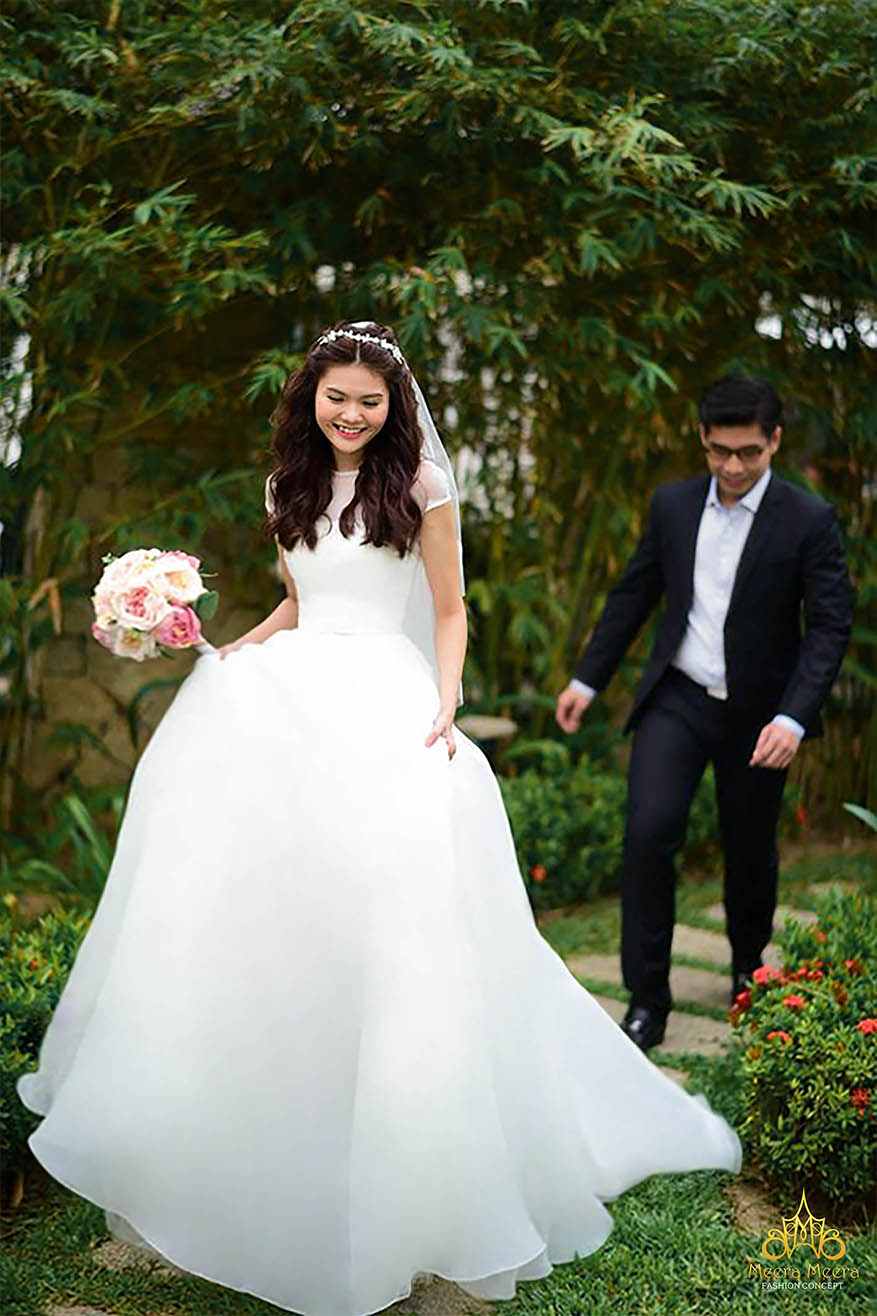 Trong khuôn viên của một resort sang trọng tại Nha Trang, cặp đôi Phuong My & Hieu đã cùng nhau tận hưởng một ngày chụp hình ngoại cảnh tươi vui và vô cùng thoải mái. Nổi bật nhất là hình ảnh cô dâu diện lên người chiếc áo cưới voan tùng chuông thuần khiết nhà Meera Meera. Mẫu thiết kế tối giản thực hiện trên nền chất vải suôn mượt, bắt sáng tự nhiên óng ả rất phù hợp với bầu không khí nghỉ dưỡng, đồng thời mang lại sự tự tin và thoải mái cho cô dâu suốt cả ngày dài.