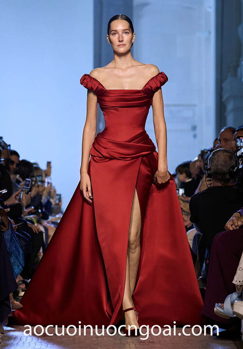 “Ông hoàng” Elie Saab tiếp tục trình làng những bộ cánh là lượt mang đậm phong cách Hoàng gia Trung Đông. Trong đó, các cô dâu tương lai sẽ có cho mình một gợi ý vô cùng hấp dẫn – một chiếc váy cưới Haute Couture màu đỏ rực rỡ. Tác phẩm thực hiện trên chất vải satin thượng hạng, ứng dụng kỹ thuật draping điêu luyện tạo hình nên cổ áo mở khoe trọn khung xương quai xanh cùng bờ vai tuyệt mỹ, thân áo siết eo đi cùng chi tiết đắp tà khoe chân thon và kết thúc bằng tùng váy xoè hoành tráng.