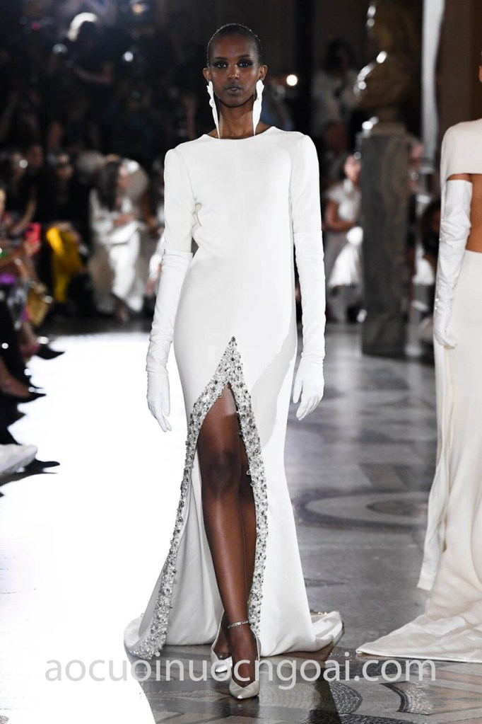 Nhà mốt Couture Stéphane Rolland gửi đến cô dâu tương lai chiếc váy cưới xẻ tà đầy lôi cuốn. Mở đầu với cổ áo thuyền cùng tay dài phối găng tay trang nhã, phom dáng ôm gọn theo đường cong cơ thể và thu hút mọi ánh nhìn vào chi tiết đính kết tinh xảo trên đường xẻ tà khoe trọn đôi chân nuột nà, thon thả.