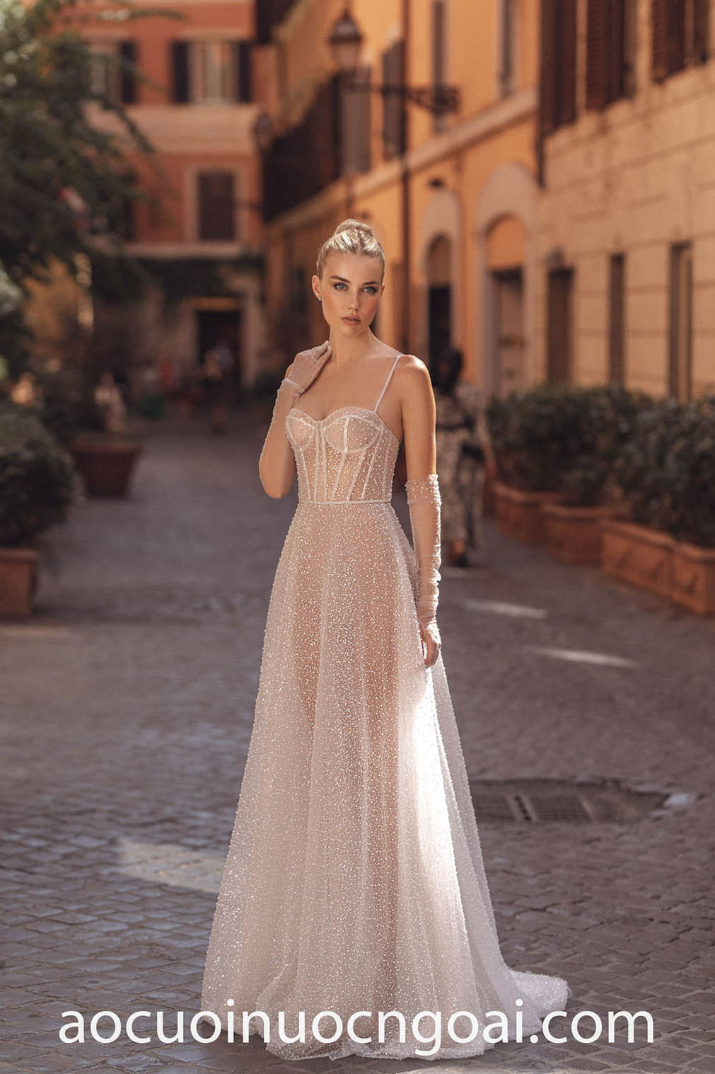 Áo cưới hai dây đặc biệt thích hợp với các kiểu đính kết trang trí lấp lánh, mang đến bầu không khí tiệc tùng vui tươi. Bạn có thể lựa chọn cho mình kiểu áo cưới 2 dây thân corset giúp tôn vinh đường cong sắc nét của cơ thể, được thực hiện trên nền chất liệu ánh kim sa bắt mắt giúp bạn hoàn toàn toả sáng trong các đêm tiệc cưới. Hoặc cũng có thể lựa chọn phong cách thanh lịch, duyên dáng với kiểu đầm cưới hai dây tùng lưới bay bổng, thu hút sự chú ý vào các hoạ tiết đính kết lung linh, nhẹ nhàng.