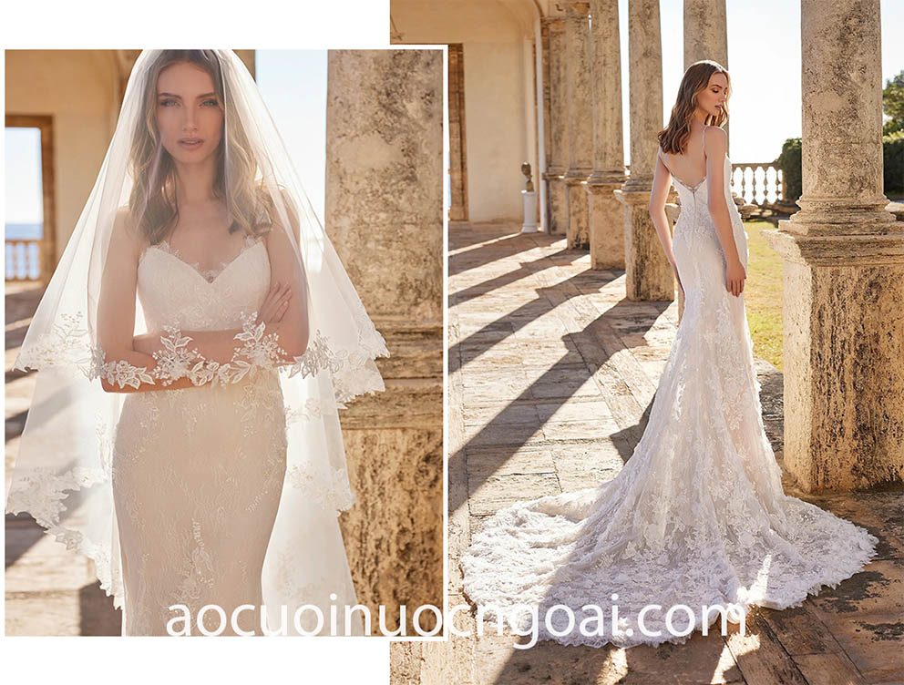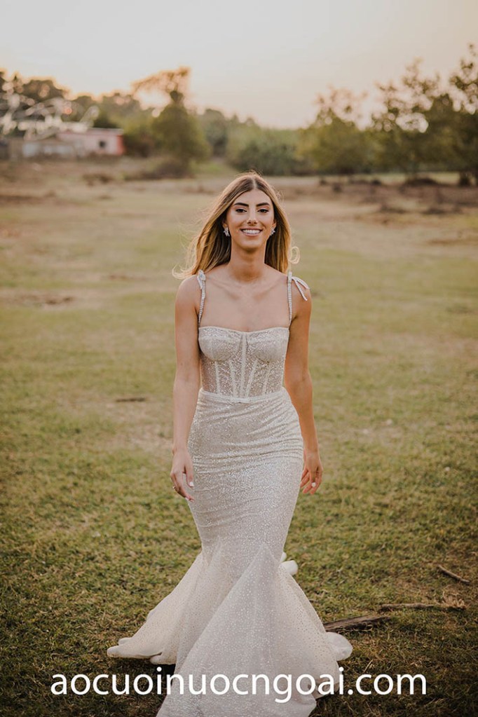 Với những cô dâu sở hữu số đo 3 vòng gợi cảm, váy cưới đuôi cá 2 dây là lựa chọn lý tưởng giúp bạn khai thác tối đa những đường cong mỹ miều của cơ thể. Đó có thể là chiếc váy cưới lụa cắt may đơn giản nhưng đầy thu hút với cổ áo 2 dây xẻ sâu, kết hợp cùng chi tiết khoe tấm lưng trần nuột nà. Hay cũng có thể là chiếc áo cưới đuôi cá hai dây phối ren hoàn thiện vẻ đẹp quyến rũ mà lại vô cùng lãng mạn mà bạn đang muốn hướng tới.