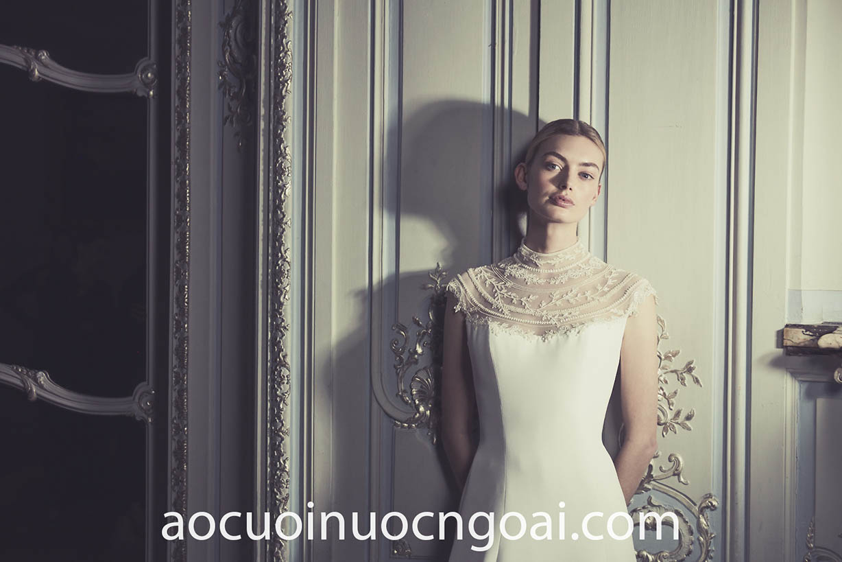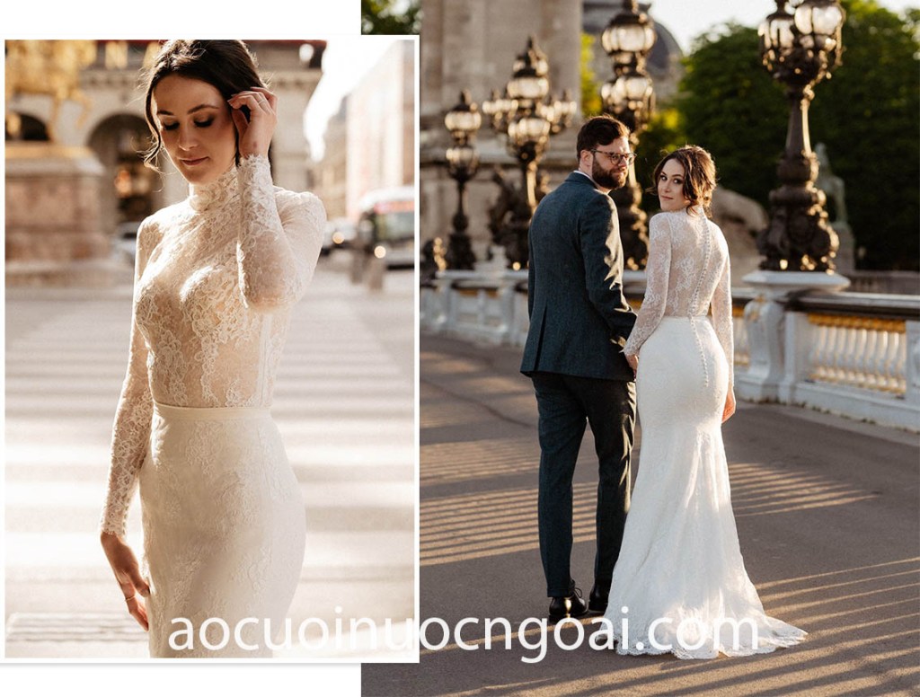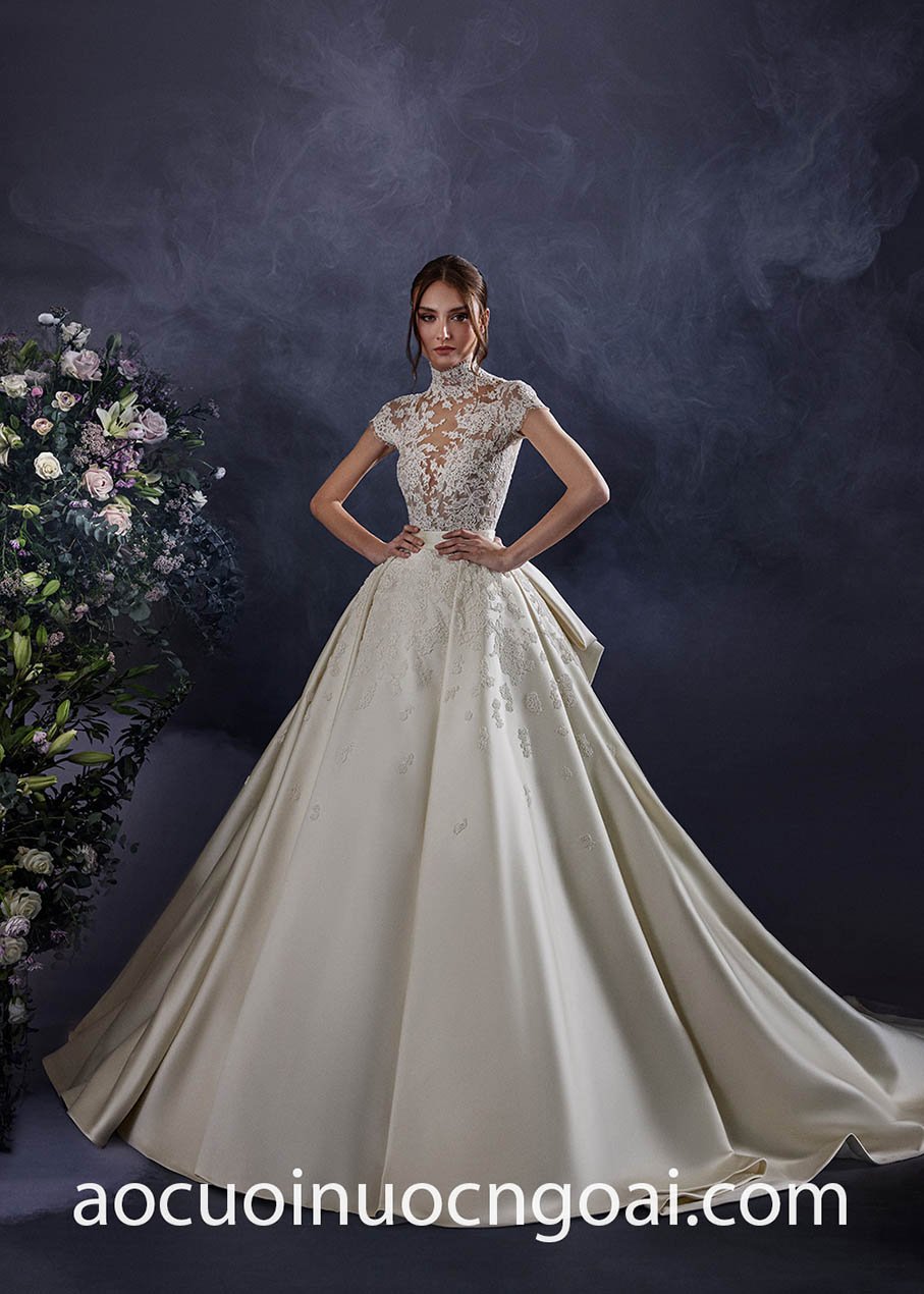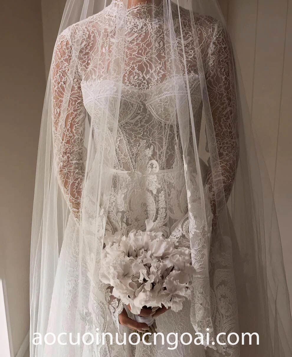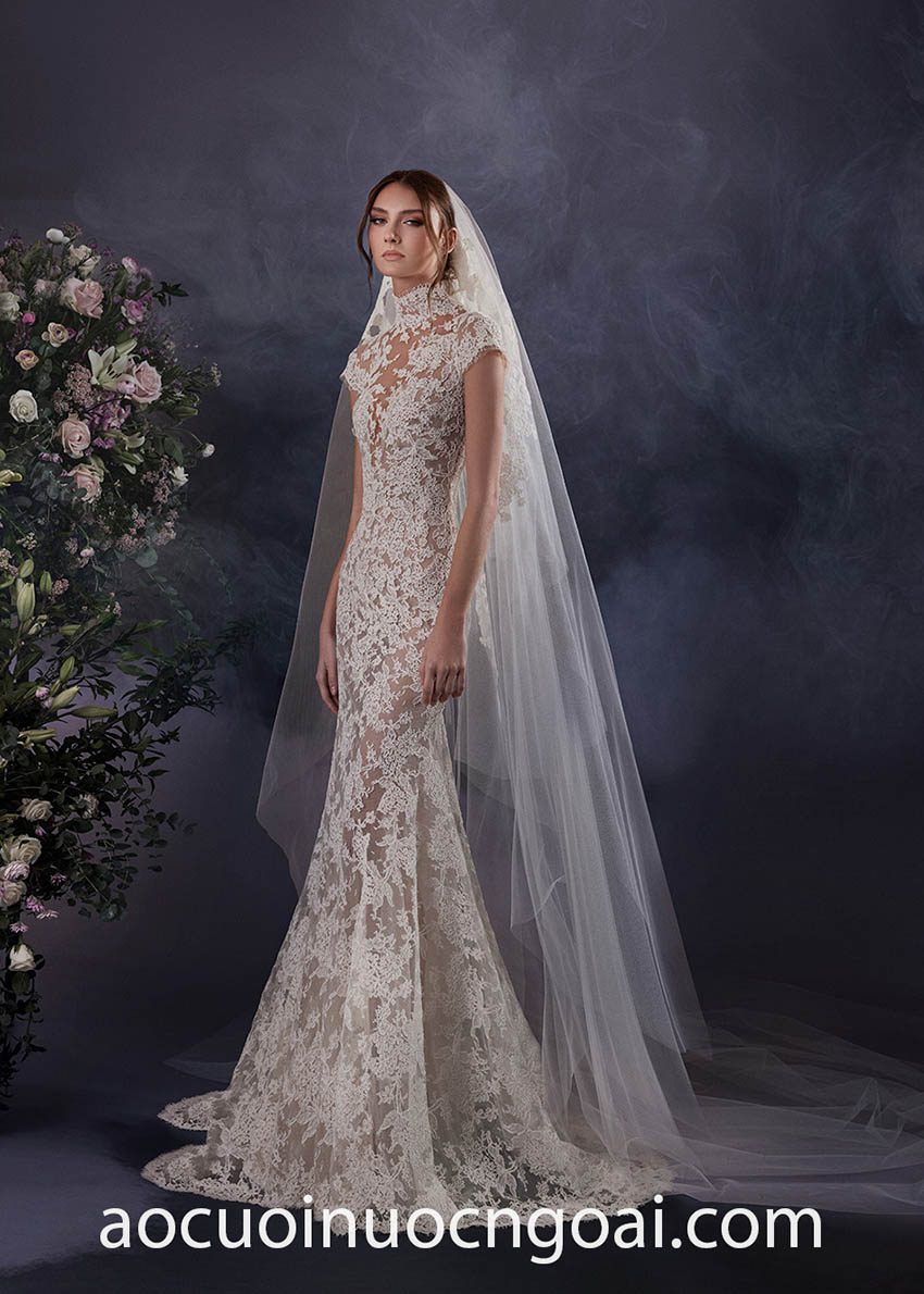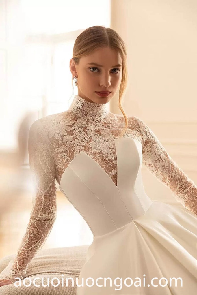 ÁO CƯỚI CỔ CAO PHỐI REN LÃNG MẠN