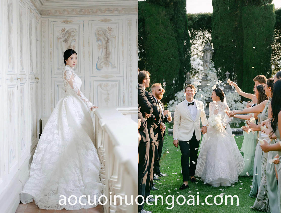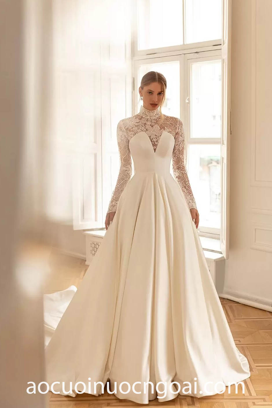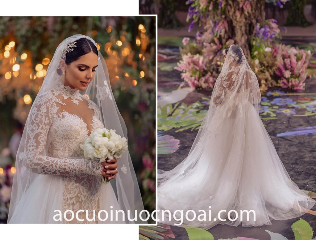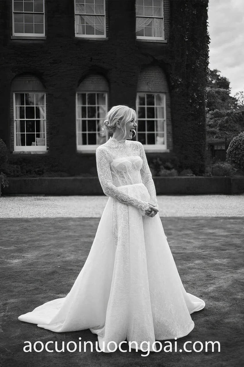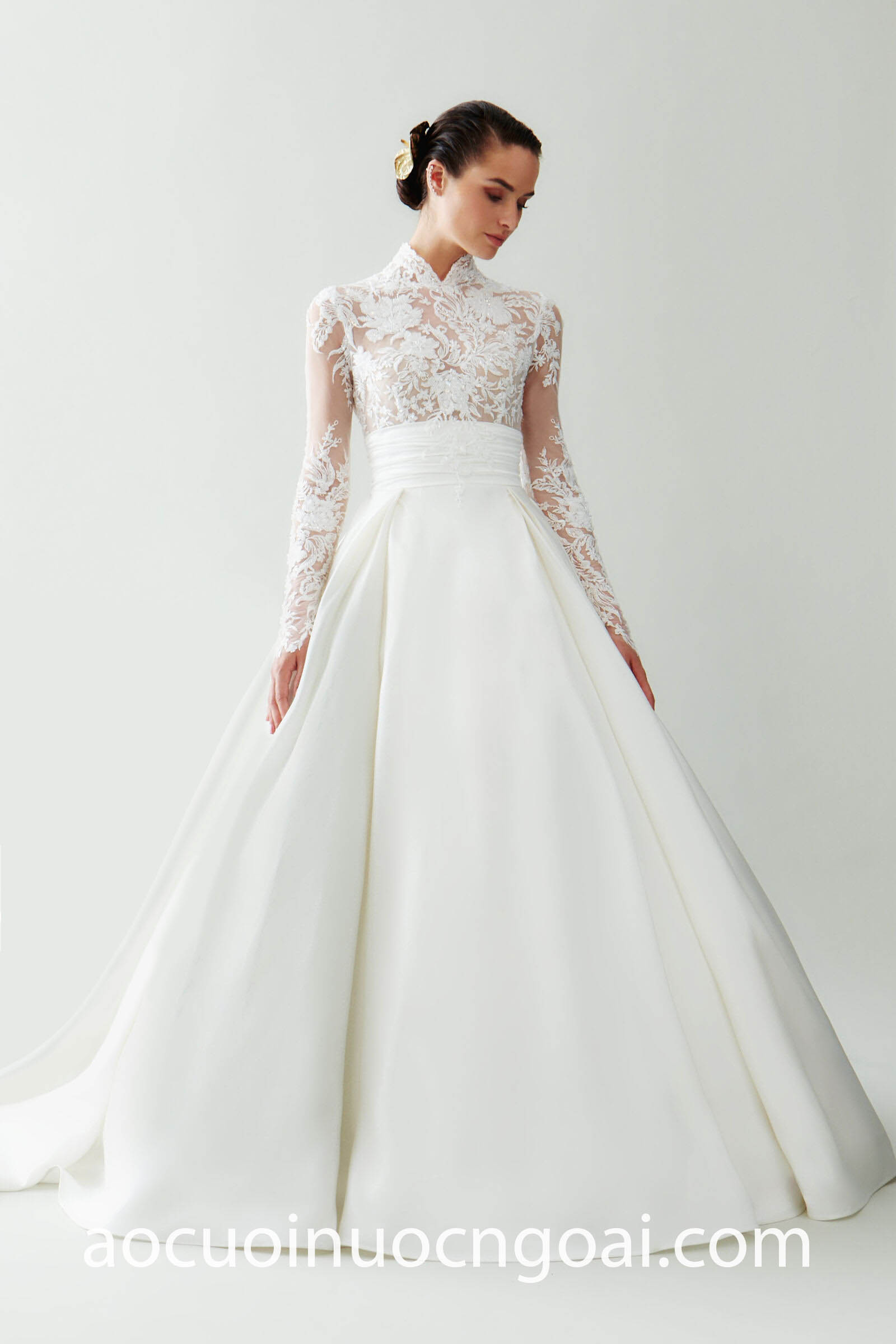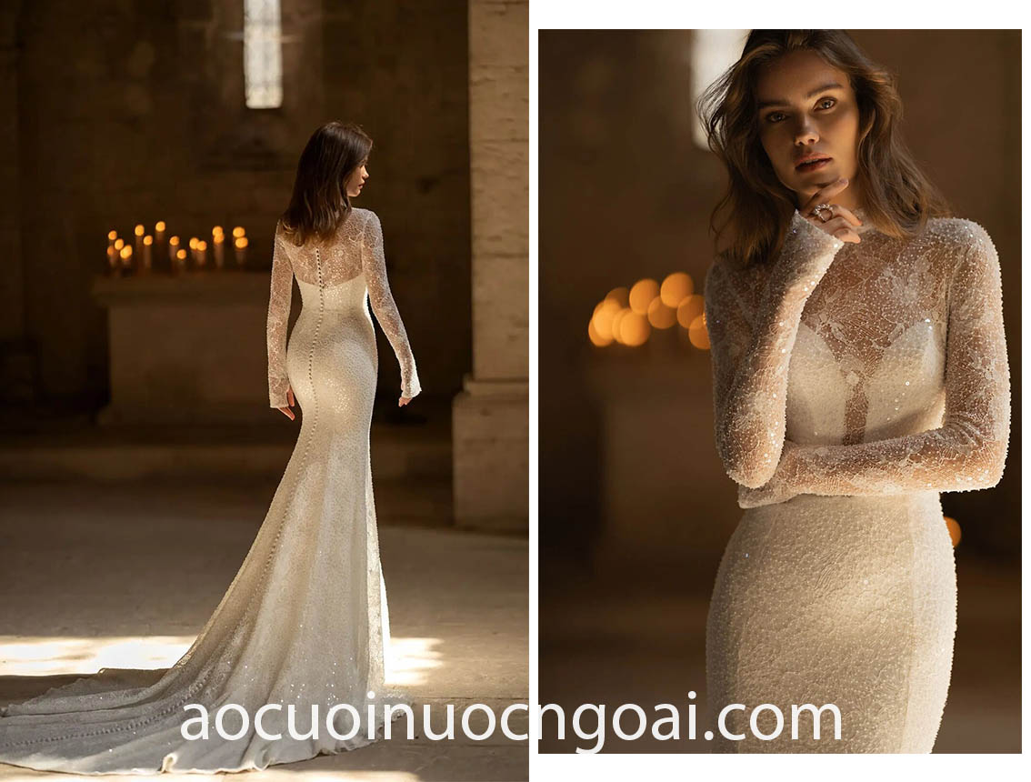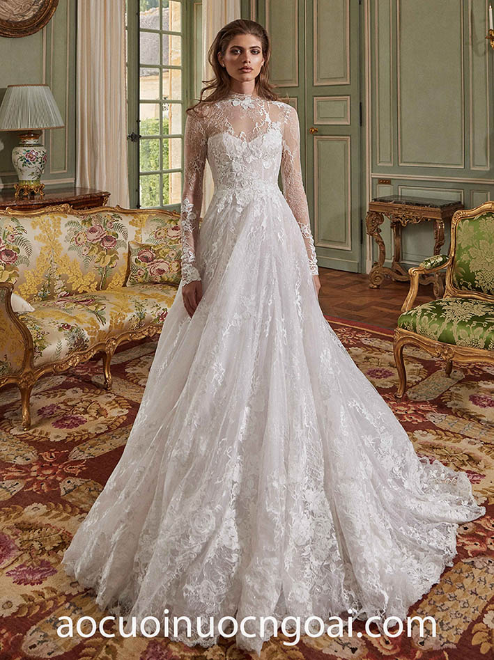 ÁO CƯỚI CỔ CAO PHỐI REN LÃNG MẠN