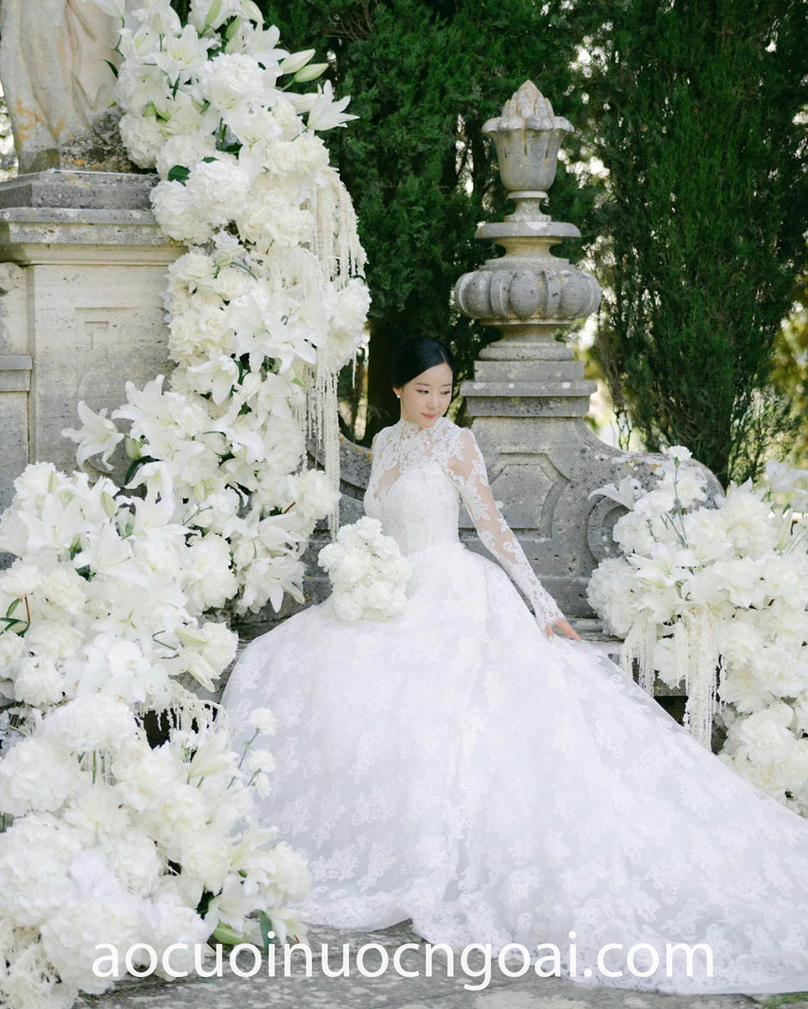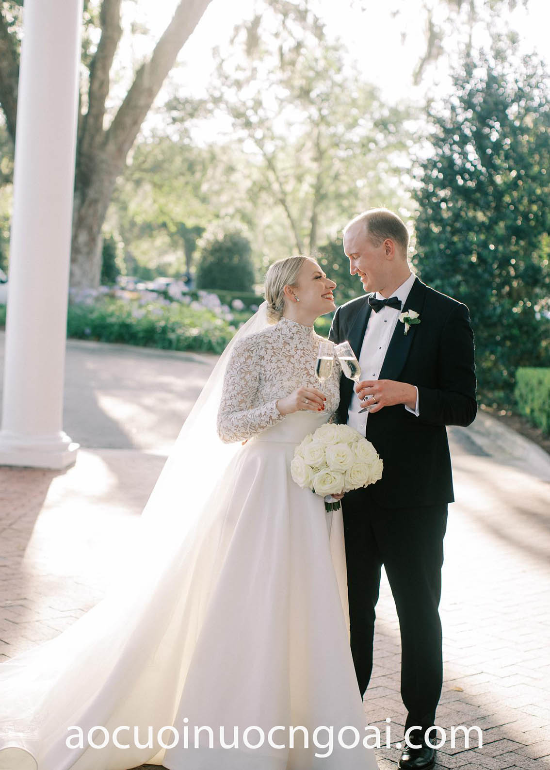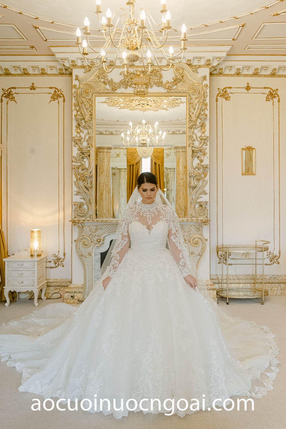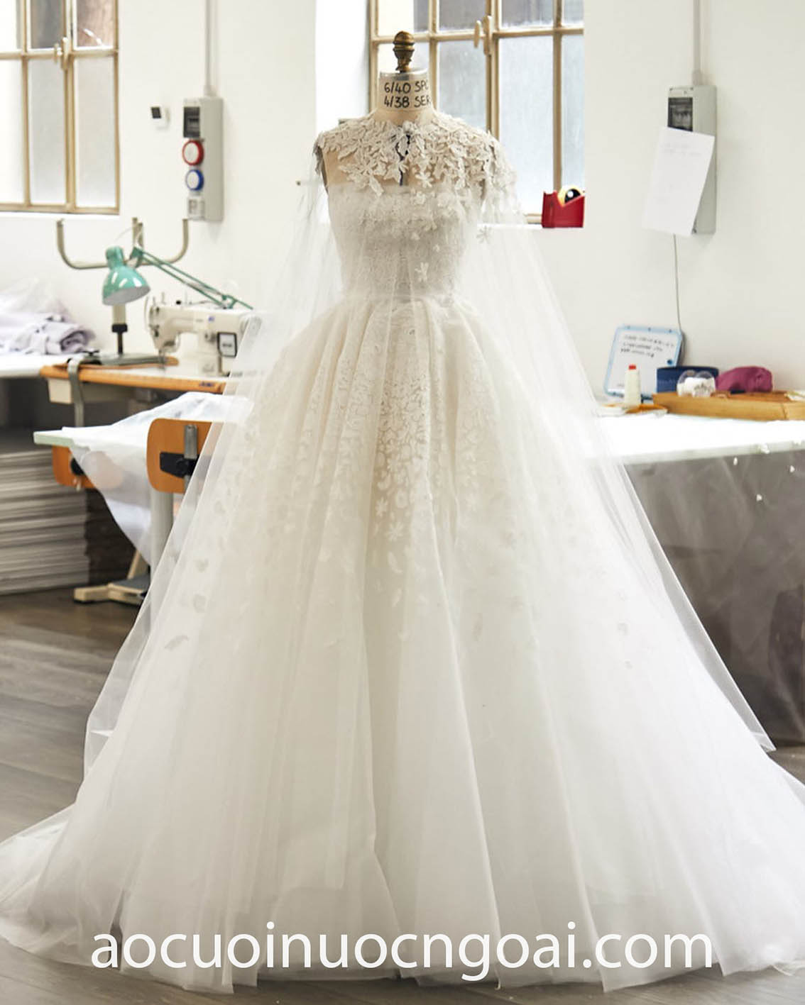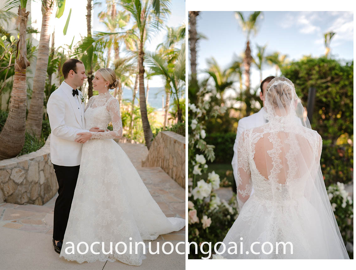 ÁO CƯỚI CỔ CAO PHỐI REN LÃNG MẠN