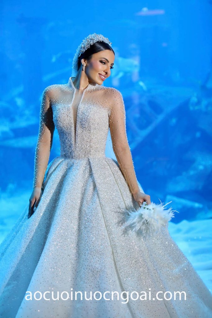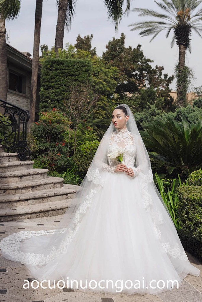 Nếu bạn dự định tổ chức lễ cưới trong Nhà thờ—áo cưới làm lễ cổ cao tay dài kín đáo luôn là gợi ý lý tưởng nhất, hình ảnh cô dâu truyền thống sẽ giúp bạn ghi điểm tuyệt đối trong mắt mọi quan khách.