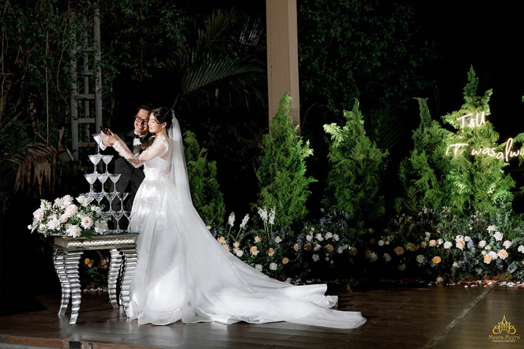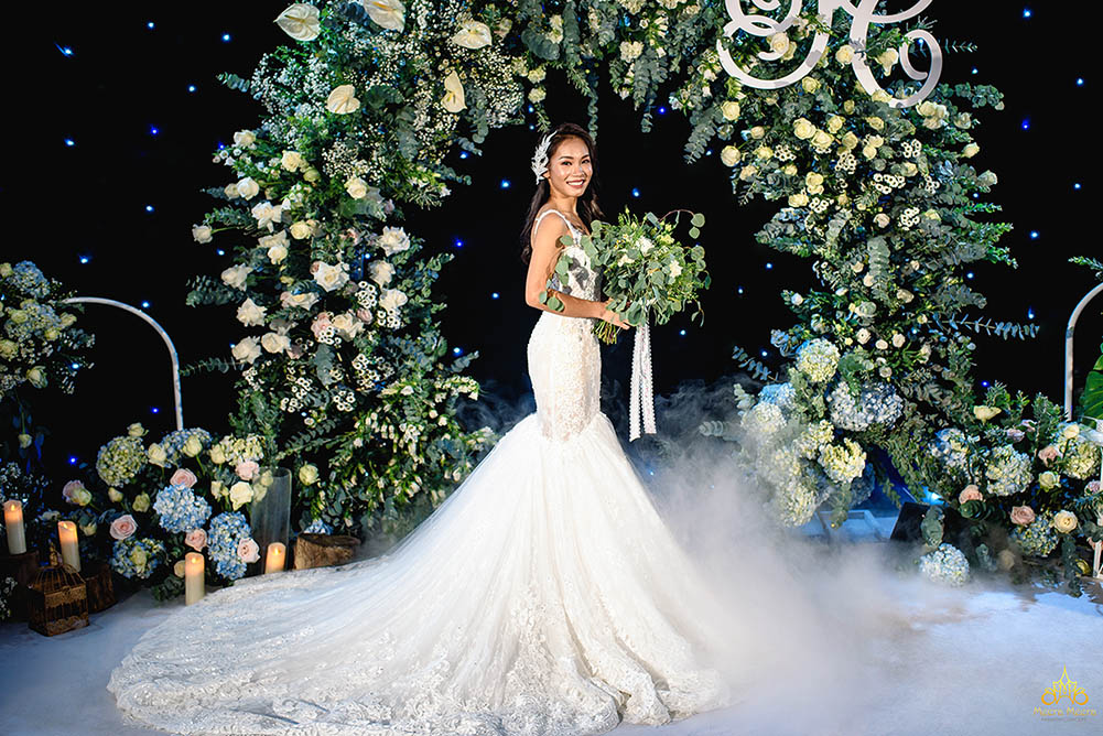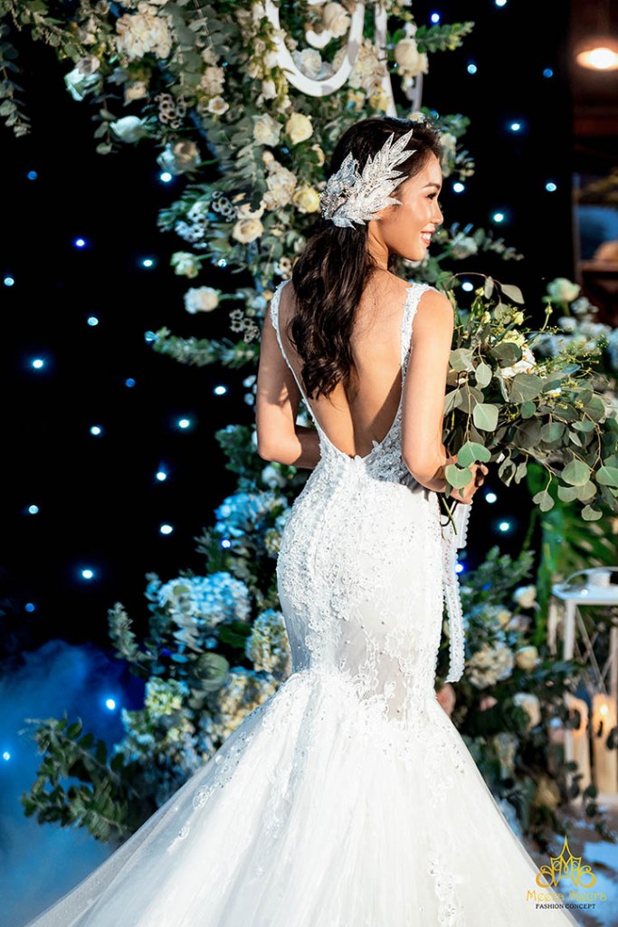 Mang trong mình vẻ đẹp quyến rũ và phong thái tự tin, cô dâu Meirin Hoang khiến toàn bộ quan khách phải trầm trồ khen ngợi khi diện lên người chiếc áo cưới đuôi cá trumpet thật lộng lẫy. Sáng tạo đến từ thương hiệu Meera Meera Fashion Concept gây ấn tượng với phom váy cắt tôn dáng hoàn hảo, thân áo sử dụng hệ thống corset giúp siết eo nâng ngực tự nhiên, nổi bật với cổ áo chữ U thời thượng cùng chi tiết hở lưng sâu vô cùng quyến rũ. Trong khi toàn bộ váy cưới được trang trí bởi hoạ tiết ren và pha lê đính kết công phu, mang đến cho cô dâu vẻ đẹp rạng ngời “mê hoặc” lòng người.